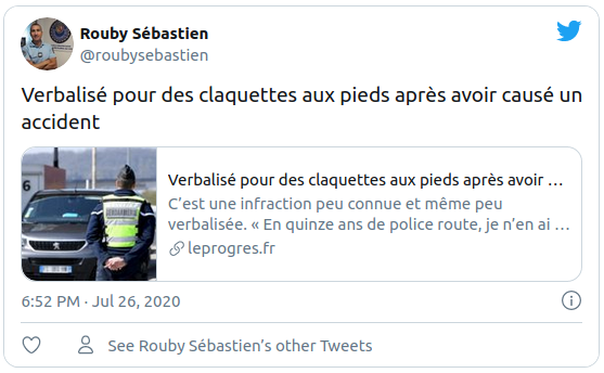 Les gendarmes se sont aperçus que le conducteur de la voiture avait des claquettes aux pieds. « On ne peut pas conduire pieds nus, en claquettes ou en tongs. C'est pourtant quelque chose qu'on apprend en passant son permis de conduire. Il faut avoir des chaussures fermées ou attachées, sinon le risque est que le pied glisse ou n'accroche pas suffisamment sur les pédales », ont-ils fait remarquer.