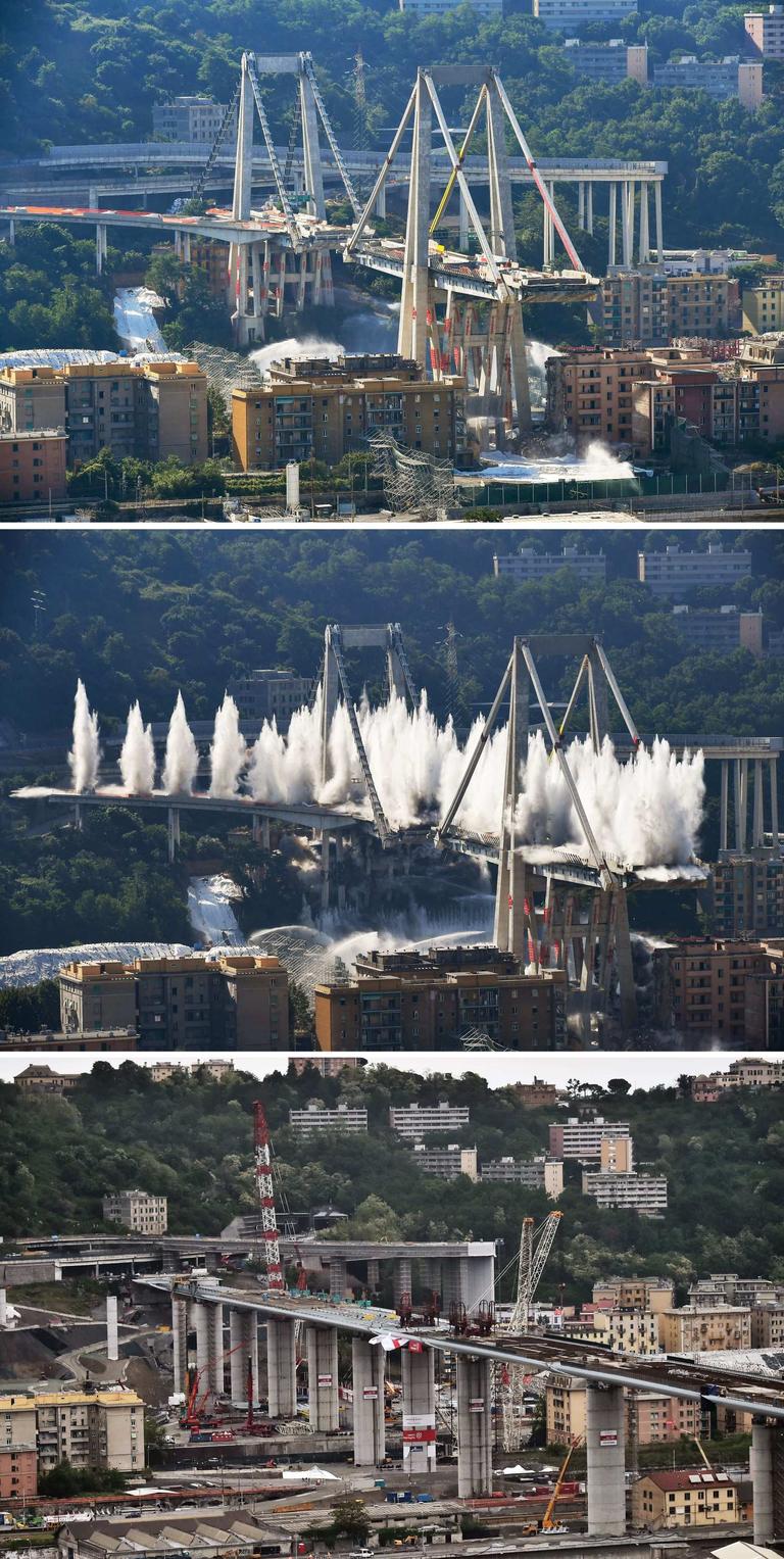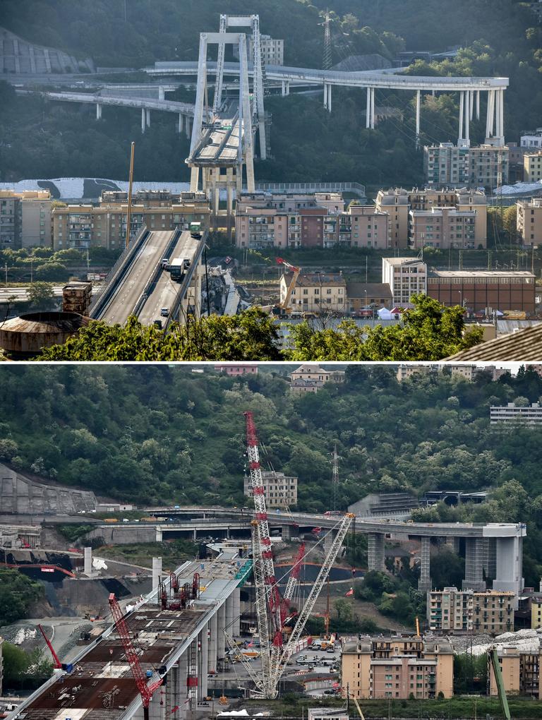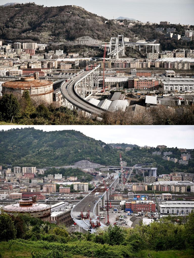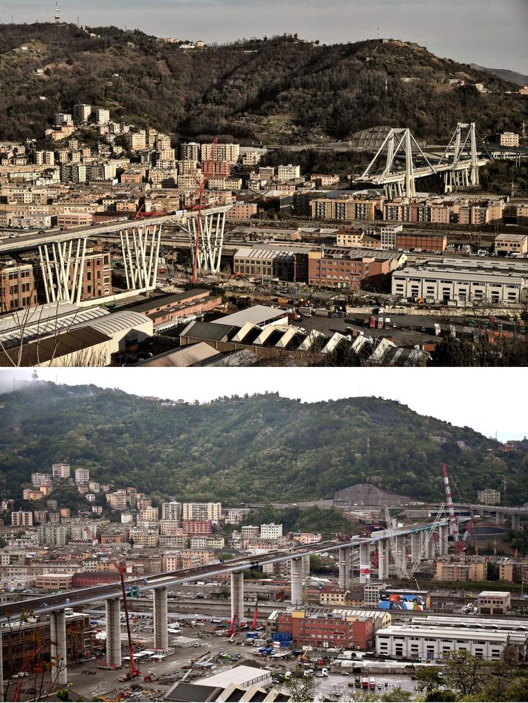 1067 mètres de route, posés sur 18 piles elliptiques à une hauteur moyenne de 45 mètres au-dessus de la ville de Gênes. Le nouveau pont, inauguré ce lundi 3 août, se distingue par sa simplicité et sa sobriété. Voici quelques photos comparant la nouvelle structure avec l'ancienne.