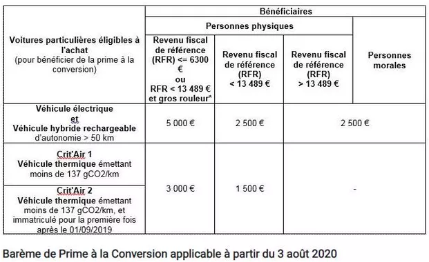 La prime est doublée pour les ménages avec un revenu fiscal de référence inférieur ou égal à 6300 euros par part et pour les « gros rouleurs » non imposables (ceux qui roulent plus de 30 km pour se rendre à leur travail). Ces populations peuvent ainsi obtenir jusqu'à 3000 euros de remise pour l'achat d'un modèle thermique et 5000 euros d'aide pour l'achat d'un véhicule électrique ou hybride neuf ou d'occasion.