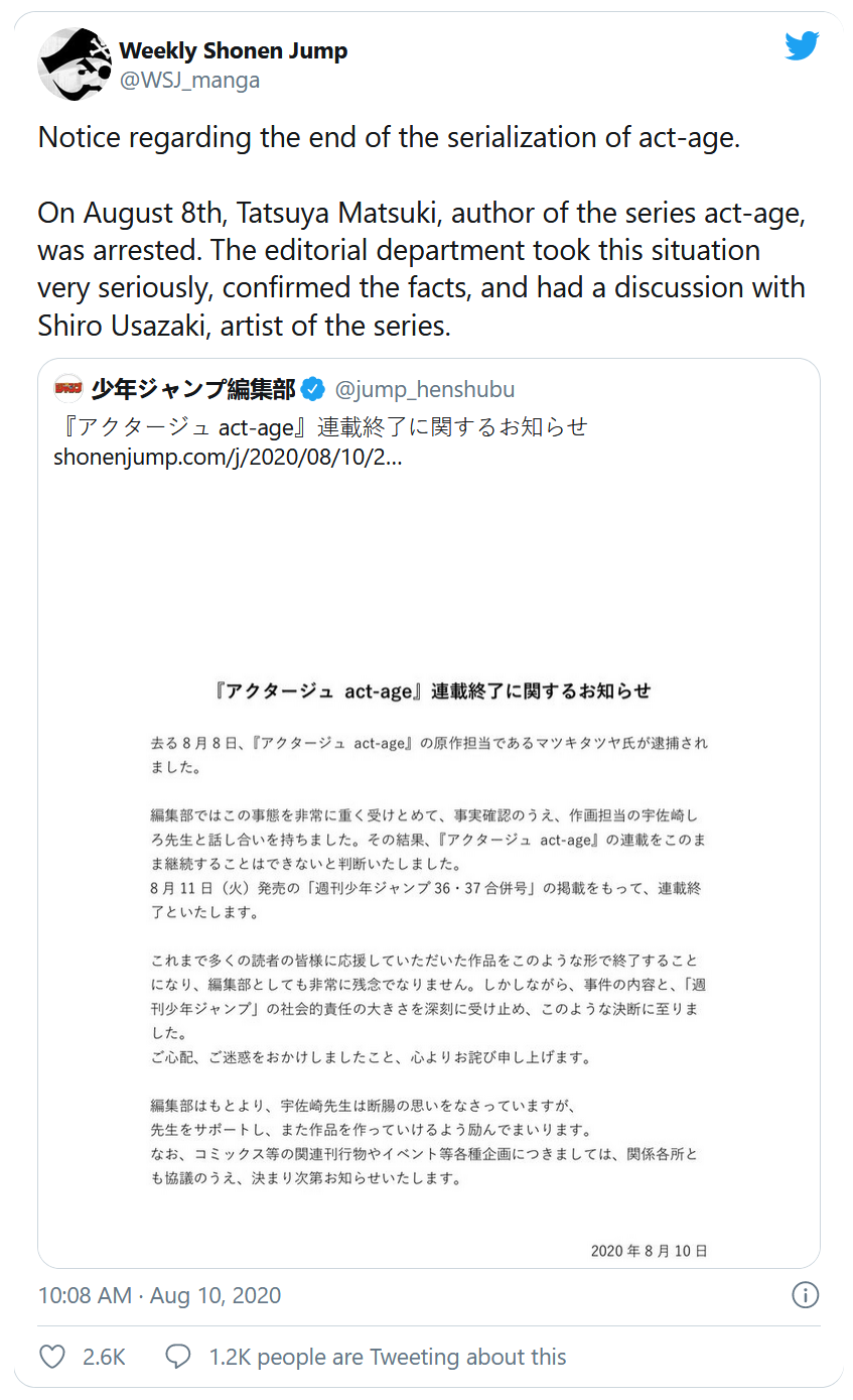 L'éditeur japonais du mangaka, la très célèbre Shueisha, avait immédiatement présenté ses excuses et annonçait réfléchir à la décision à prendre. Le 10 août 2020 sur Twitter, la maison d'édition a annoncé l'arrêt de Act-Age, scénarisé par Tatsuya Matsuki. Il s'agissait d'un manga sur une adolescente sans parents qui doit se débrouiller pour survivre avec ses frères et sœurs, et rêve de devenir actrice. L'éditeur continuera toutefois à travailler sur ses futurs projets, avec Shiro Usazaki, la dessinatrice du manga, non-impliquée dans les faits et consultée sur la question de l'arrêt du manga.