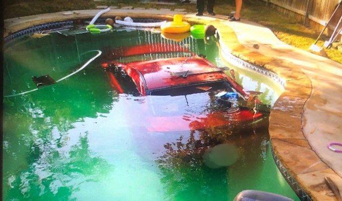 Après avoir raté un virage, cette Mitsubishi Lancer rouge a terminé au fond d'une piscine.