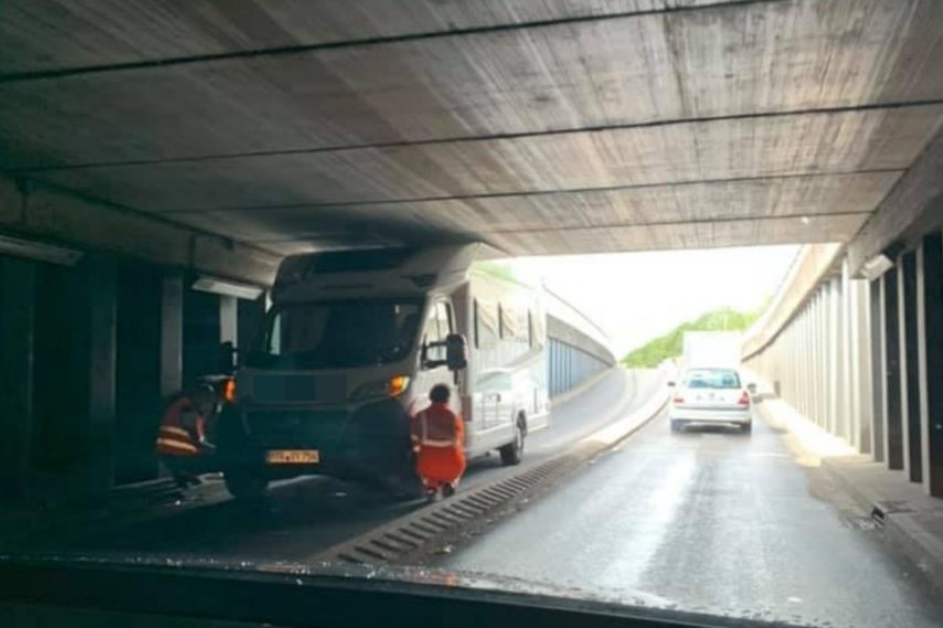 Le déclencheur : un nouvel incident survenu lundi 17 août, donc, un peu après 12h30. Un camping-car, aux dimensions inadéquates, s'est à nouveau retrouvé bloqué sous la trémie dont la hauteur n'excède pas les 2,60 mètres. Si la Dirno a confirmé que la signalétique, en français et en anglais, était présente aux abords du passage souterrain, le gabarit (la barre rayée qui permet d'évaluer au préalable la hauteur des véhicules) avait été détérioré par un camion puis retiré.