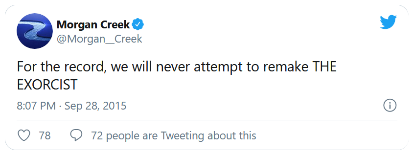 Il s'agirait ainsi du premier remake de la franchise, qui a déjà connu 4 autres films placés dans l'univers de L'Exorciste, qui racontaient les événements faisant suite ou précédant l'histoire originale. La franchise rejoint donc la longue liste de films d'horreur rebooté, après Carrie (2013), Ça (2017), ou encore Ne nous jugez pas (le remake étant appelé We are what we are est sorti en 2013). Une nouvelle qui fera donc plaisir à certains, mais pas forcément à tous, tant la qualité de ces remakes est à géométrie variable : Carrie n'avait par exemple convaincu ni les critiques, ni les spectateurs, qui l'avaient noté positivement à hauteur de 44% sur le site Rotten Tomatoes. Morgan Creek, qui a déjà produit le reboot de The Thing, noté à 42% sur Rotten Tomatoes, avait pourtant explicitement promis de ne pas faire de remake de L'Exorciste en septembre 2015 :