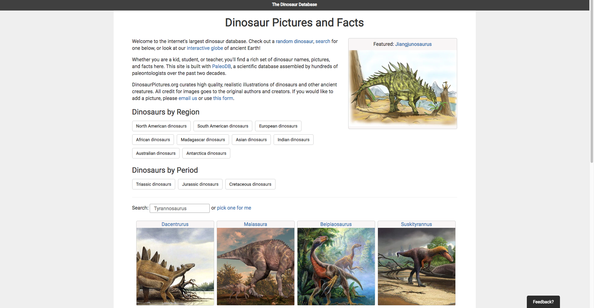 Dinosaur Pictures and Facts est une base de données scientifiques rassemblées par des centaines de paléontologues au cours des deux dernières décennies. Le site propose des illustrations réalistes de haute qualité des différents dinosaures qui ont existé, ainsi que d'autres créatures qui ont peuplé la Terre bien avant nous.