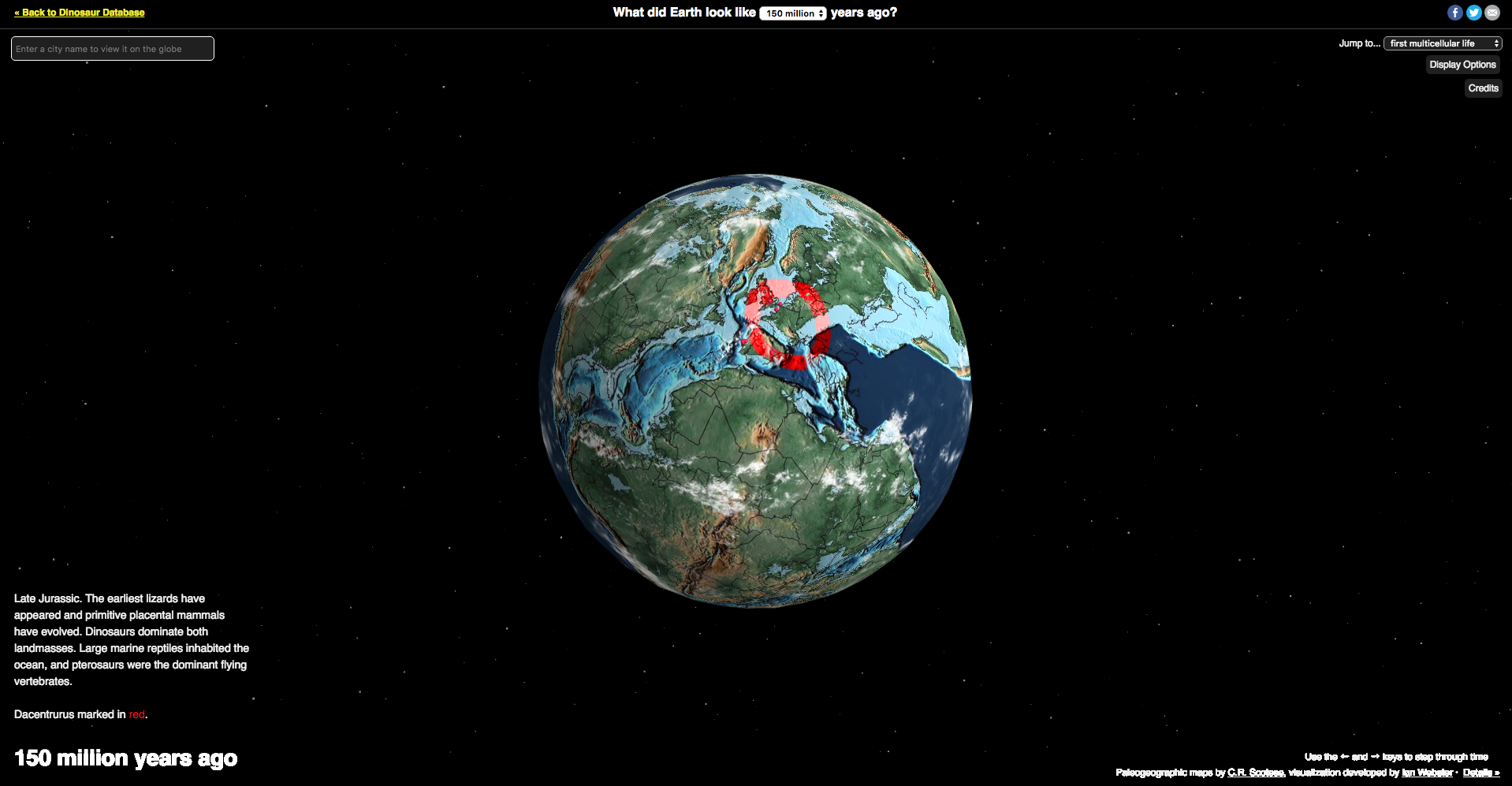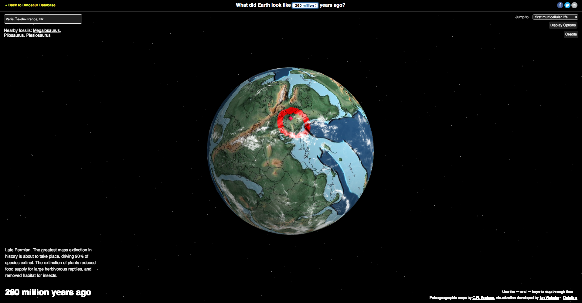 Cette encyclopédie très bien documentée se nomme The Dinosaur Database, et elle comporte une reproduction du globe (en carte interactive) d'aujourd'hui jusqu'à il y a - 750 000 000 d'années. Cette visualisation est créée et maintenue par Ian Webster, une sorte de scientifique fou qui vous fait sauter dans le temps en un seul clic. À vous de décider où vous voulez vous rendre, et surtout, quand !