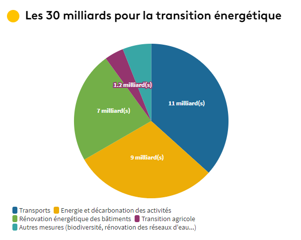 Enfin, selon les annonces, 9 milliards seront affectés à l'accompagnement des entreprises dans leur transition énergétique, notamment via la recherche et l'innovation, dont 2 milliards pour développer l'hydrogène "vert", dont la production ne dépend pas des hydrocarbures. Concernant les autres mesures, une enveloppe est prévue pour la biodiversité et 300 millions d'euros iront à l'accélération de la rénovation des réseaux d'eau, en particulier outre-mer.