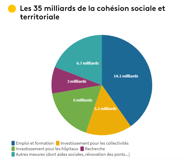 Pour le reste, 5,2 milliards d'euros iront soutenir l'investissement des collectivités. Environ 6 milliards d'euros, débloqués dans le cadre du Ségur de la santé, sont prévus pour le soutien à l'investissement des hôpitaux. Parmi les aides sociales, on trouve une augmentation de 200 millions d'euros du plan pauvreté et anti-exclusion. Il reste un peu plus de 5 milliards dont le détail n'est pas encore connu, mais on sait qu'il est prévu notamment 350 millions d'euros pour financer la rénovation de ponts en danger sur les territoires.