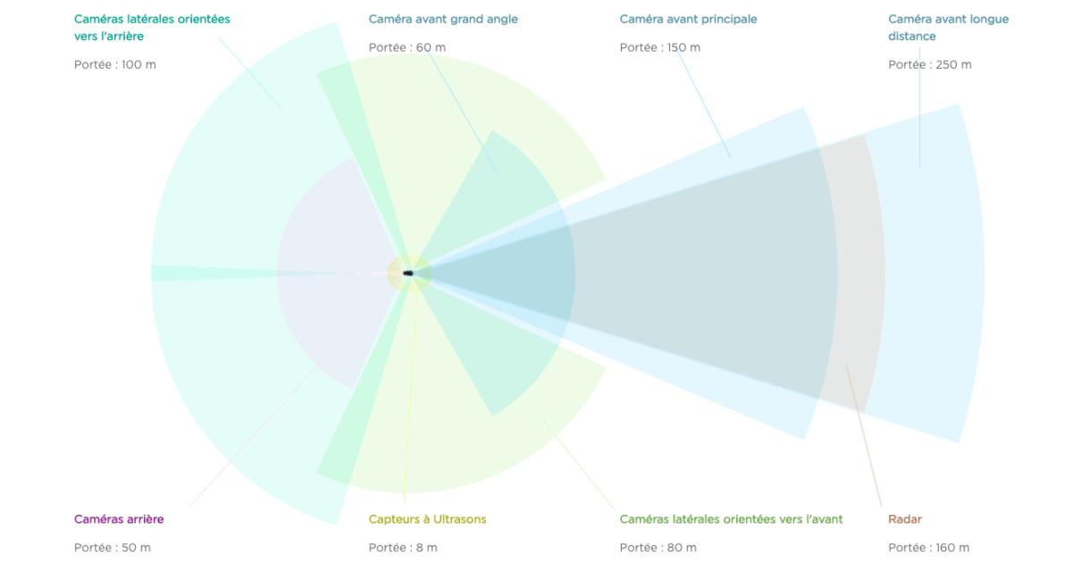Pour fonctionner, comme vous devez vous en douter, une multitude de caméras et de capteurs bardent chaque recoin de la voiture. Le système de pilotage automatique utilise un radar frontal, pas moins de huit caméras, un GPS et un sonar à 360°. Sur les huit caméras, quatre sont orientées à l'avant et viennent en support du radar. La caméra principale est capable de « voir » jusqu'à 250 mètres, mais avec un angle de vue plutôt étroit. Les autres ont des distances de vision beaucoup plus courtes, en l'occurrence 150, 80 et 60 mètres, avec un angle de vue plus large permettant d'analyser tout l'environnement autour de la voiture.