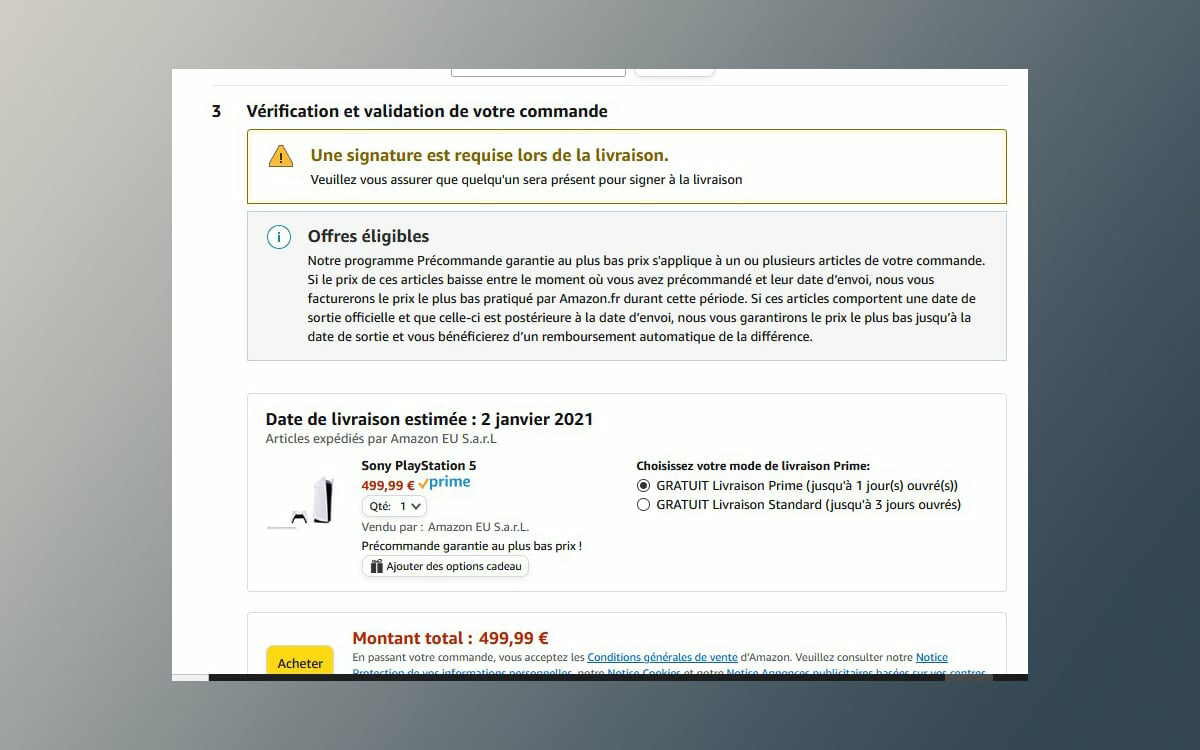 Pire encore, la date de livraison Amazon de la PlayStation 5 est passée, dans certains cas, du 19 novembre 2020 (date de sortie nationale de la PlayStation 5) au... 2 janvier 2021, comme en témoigne la copie d'écran ci-dessous :