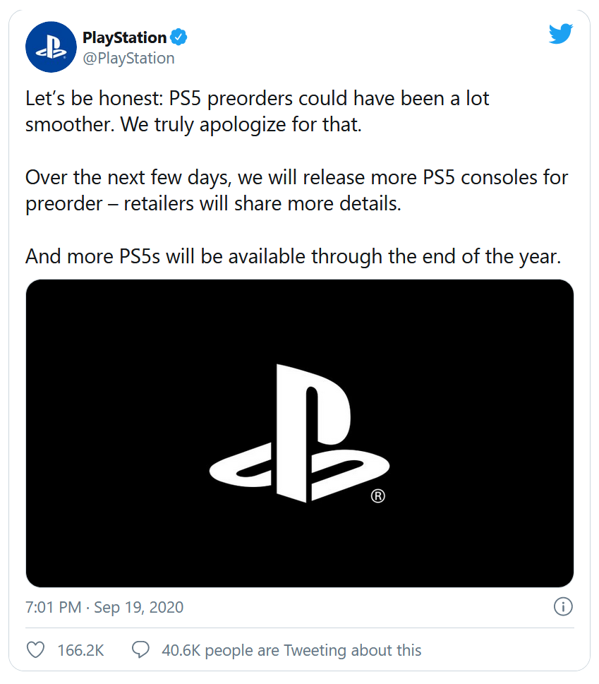 Une situation chaotique et difficilement compréhensible. Comment expliquer qu'Amazon, FNAC, Darty et Boulanger aient eu aussi peu de stock en précommande ? Les joueurs, victimes du manque de stock, ont fait part à Sony de leur profonde désapprobation, poussant le géant du jeu vidéo à adresser un message d'excuses sur Twitter :