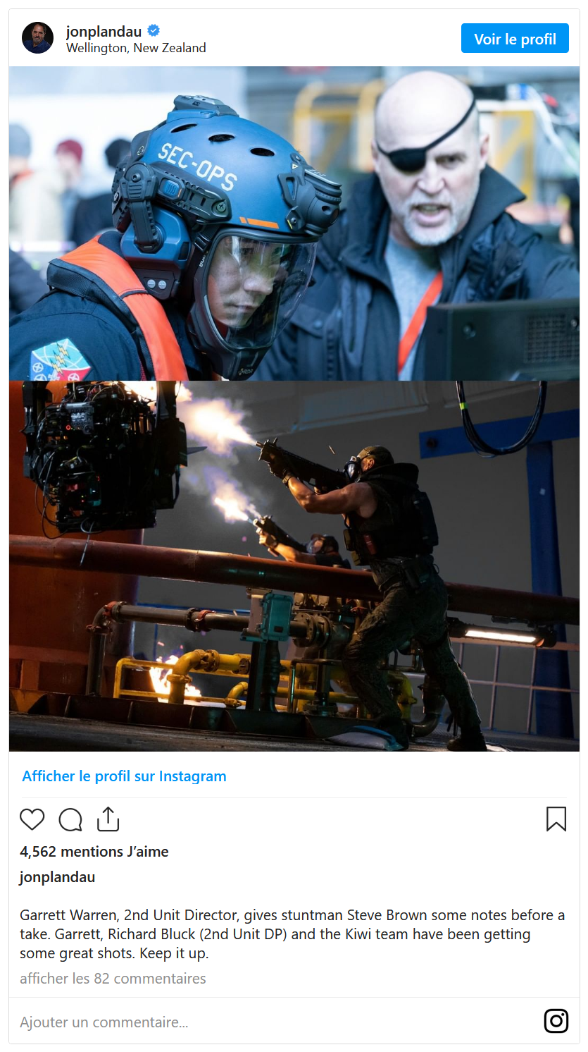 De nouveau, c'est par le biais d'Instagram que Jon Landeau, producteur sur Avatar 2, a dévoilé de nouvelles images du film. On y découvre Garrett Warren, réalisateur de la seconde équipe, donner des conseils à Steve Brown, l'un des cascadeurs du film, avant une prise. Mais ce n'est pas cette image, peu parlante, qui mérite le coup d'œil. Il s'agit plus précisément de la seconde, sur laquelle on peut découvrir deux soldats tirer à vue sur une cible probablement imaginaire.