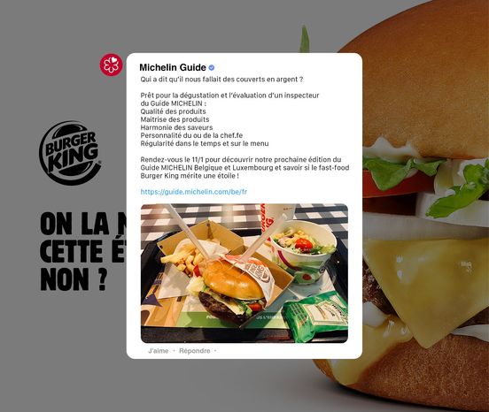 « Rendez-vous le 11/1 pour découvrir notre prochaine édition du Guide MICHELIN Belgique et Luxembourg et savoir si le fast-food Burger King mérite une étoile », promet la publication.