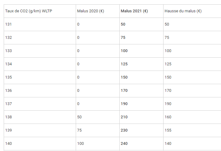 Comme c'est le cas depuis plusieurs années, le malus commencera plus tôt. Avec la norme WLTP, qui a définitivement remplacé la norme NEDC en mars 2020, le malus s'appliquera à partir de 131 g/km de CO2 au lieu de 138 g/km en 2020.