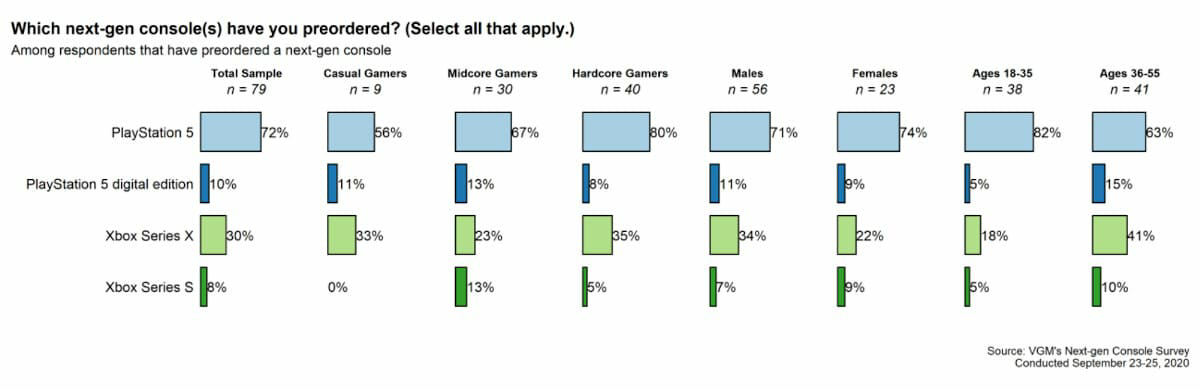 Récemment, la firme VGM, spécialisée dans les recherches issues de l'industrie du jeu vidéo, s'est penchée sur les préférences de précommandes des joueurs américains. Pour ce faire, 511 personnes ont été étudiées au moment de l'ouverture des précommandes des Xbox Series X/S et de la PlayStation 5. Parmi ce total, seulement 15% d'entre elles, soit 77 personnes, ont réussi à précommander la console de leur choix.