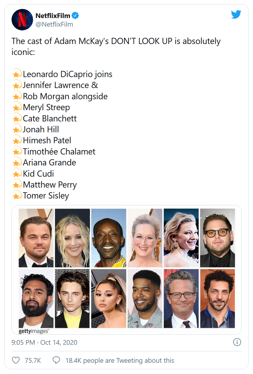 C'est un projet complètement fou dans lequel Netflix vient de se lancer. Il est rare de voir autant d'acteurs têtes d'affiche réunis dans le même film. La plateforme de streaming va produire le nouveau film de science-fiction de Adam McKay. Le réalisateur sera également scénariste de Don't Look Up. Dans ce film de SF, nous allons suivre deux astronautes qui ne sont pas pris au sérieux quand ils annoncent dans les médias qu'un astéroïde est sur le point de détruire la Terre. Netflix l'a annoncé sur l'un de ses comptes Twitter, de nombreux acteurs se joignent à l'aventure. Des noms de plusieurs générations d'acteurs, dont certains ont même été oscarisés.