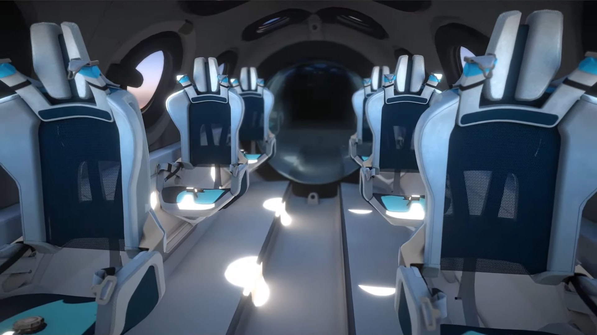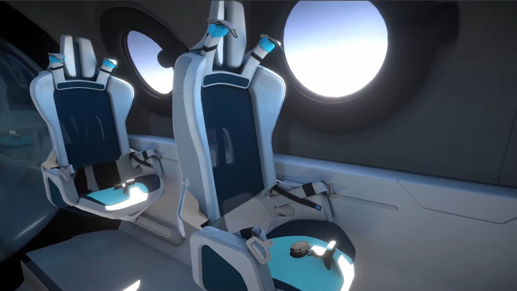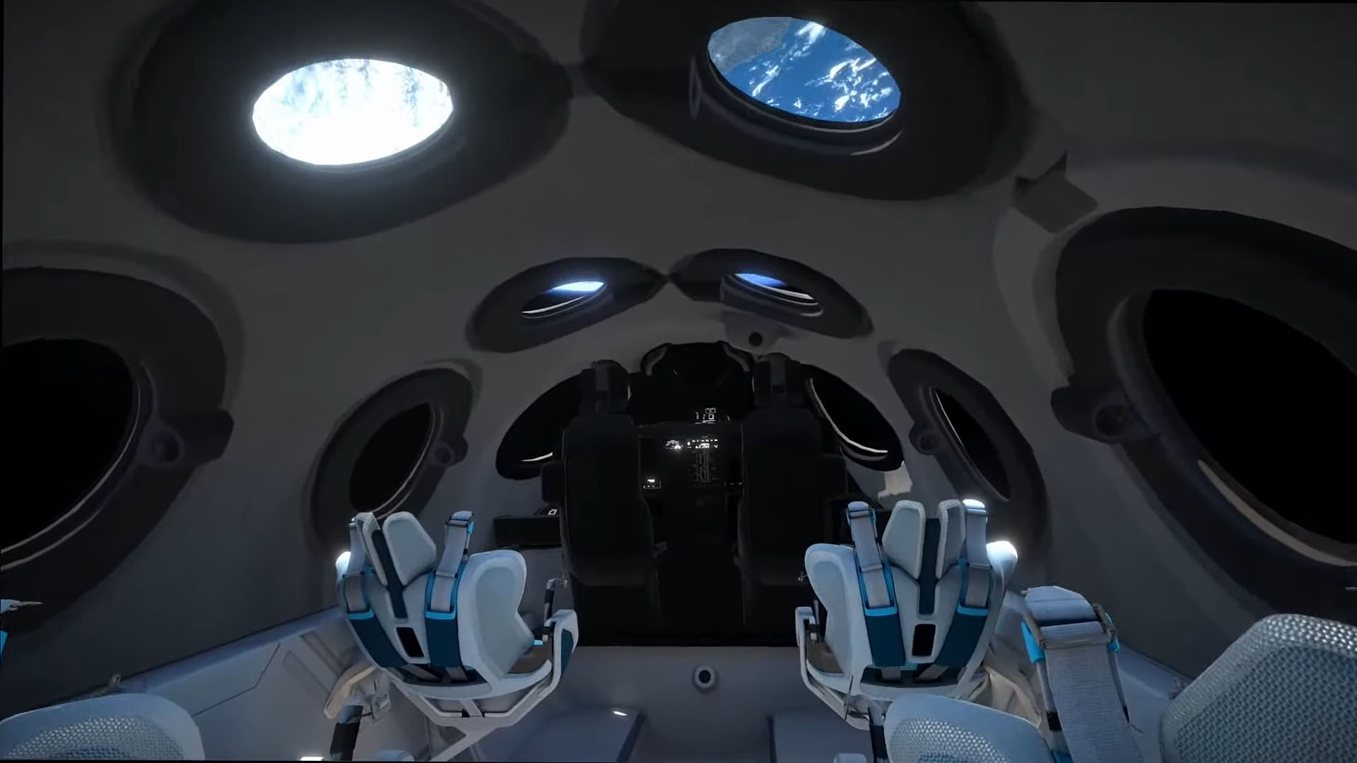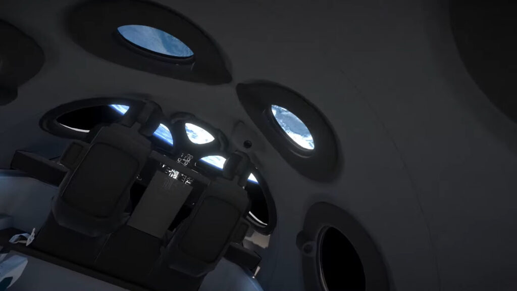 Comme dans un avion, les passagers sont situés le long des parois de l'appareil, où un hublot dédié leur permet de jeter un coup d'œil à l'intérieur. Mais ce qui change ici, c'est la présence d'autres hublots qui parcourent le reste de la carlingue, en particulier au niveau du plafond, offrant ainsi aux astronautes d'un jour l'occasion de profiter de plusieurs vues en fonction de l'orientation du VSS Unity.