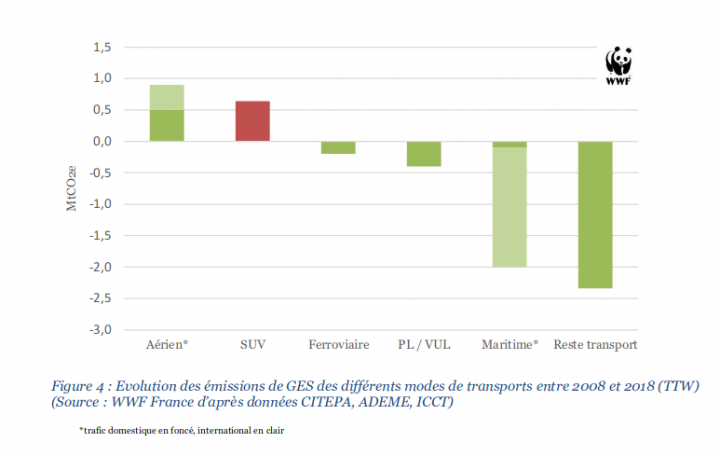 Le WWF a voulu reproduire ce travail à l'échelle française. Et ses résultats sont sans appel. En France aussi, ces dix dernières années, les 4,3 millions de SUV mis en circulation représentent la deuxième source de hausse des émissions de CO2. Cette fois-ci juste derrière le secteur aérien.