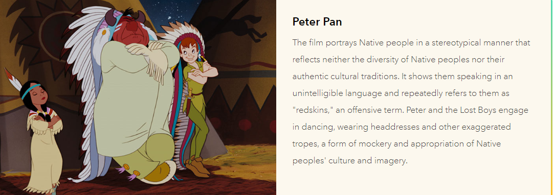 Par ailleurs, à la fin de chaque carton d'avertissement, Disney renvoie à un site internet permettant approfondir la recontextualisation de ses longs-métrages : www.disney.com/storiesmatter ! Voici ce que l'on peut trouver, à titre d'exemple, sur le site en question concernant le film Peter Pan :