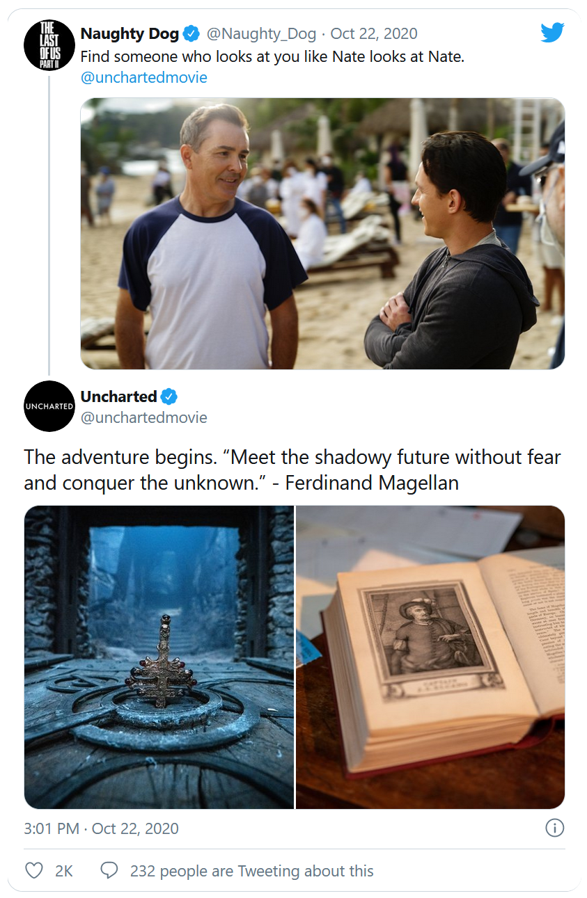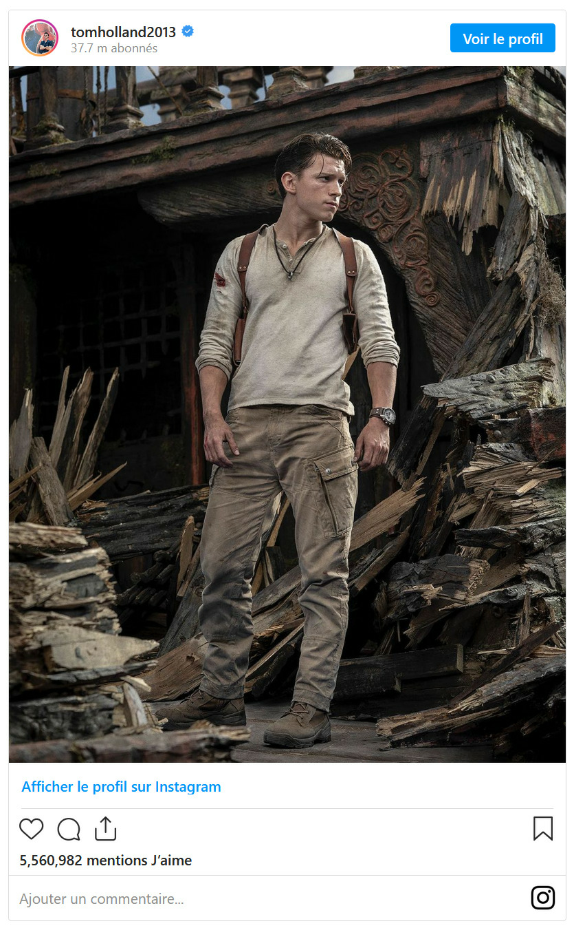 Par ailleurs, Tom Holland a dévoilé sur son compte Instagram son look en qualité de Nathan Drake dans la future adaptation prévue dans les salles américaines le 16 juillet 2021. Un report n'est cependant pas à exclure compte tenu du contexte sanitaire actuel et du chamboulement permanent du calendrier des sorties.