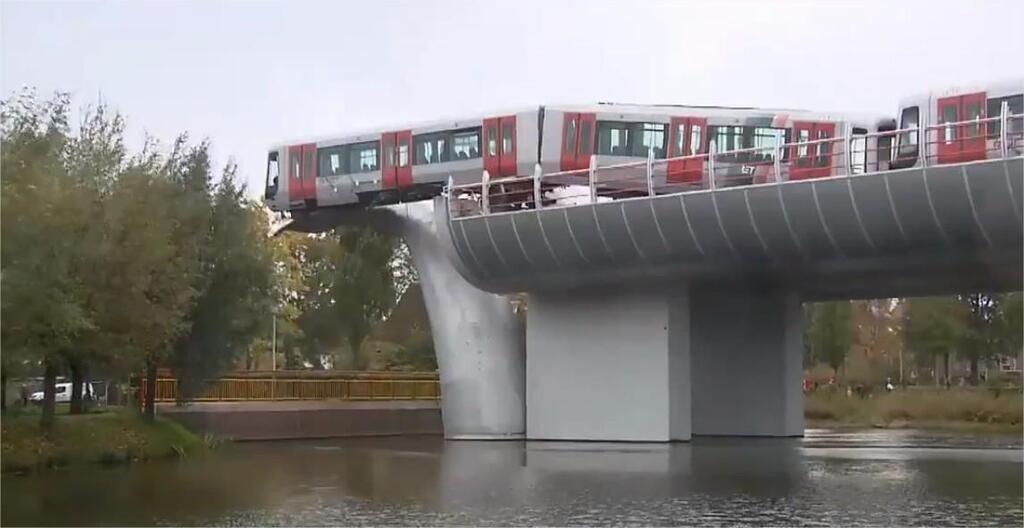 Une rame de métro aérien a failli dérailler dans l'eau lundi à Rotterdam. Heureusement, une œuvre d'art a empêché sa chute.
