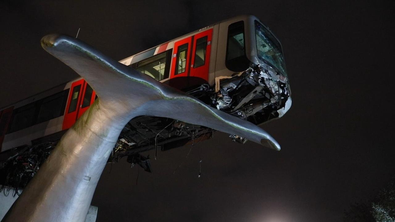 Une rame de métro qui a déraillé lundi 2 novembre 2020 près de Rotterdam aux Pays-Bas a atterri miraculeusement sur la sculpture d'une queue de baleine géante, qui l'a sauvée de la catastrophe.