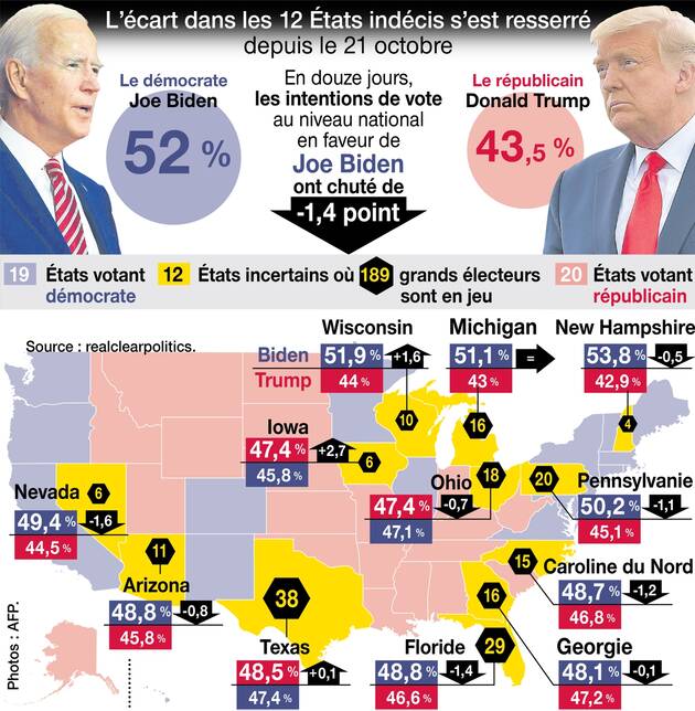 Biden a fait tout l'été la course en tête dans les sondages en Arizona (11 grands électeurs) et sa victoire ne serait pas une totale surprise. Si le démocrate l'emporte dans l'énorme Texas (38 grands électeurs en jeu), où Trump restait légèrement en tête dans les sondages, c'est fini pour le président sortant. Pire : c'est le signe d'une déroute à l'échelle nationale.