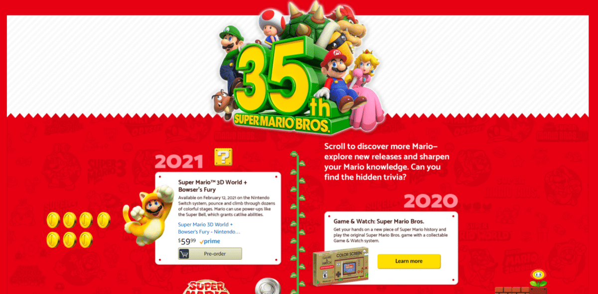 Amazon a quant à elle lancé une page entièrement consacrée au héros à la casquette rouge. Dessus, on retrouve une frise chronologique reprenant les dates clés de la licence, de sa création en 1985 aux derniers jeux publiés. De nombreuses informations y sont disséminées, permettant ainsi d'en apprendre plus le personnage le plus reconnaissable du jeu vidéo.
