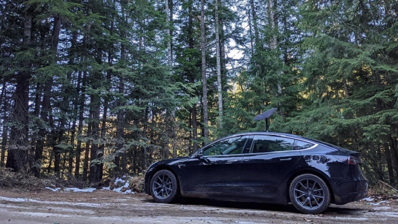 Starlink testé sur une Tesla Model 3, dans une forêt de l'Idaho.