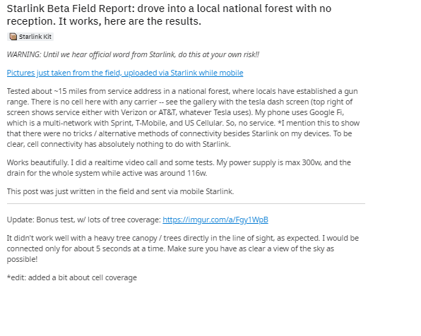 Un utilisateur de Reddit, membre du programme de test, a décidé d'essayer le dispositif en forêt. L'idée était de voir si le débit serait acceptable dans la nature, qui plus est en étant entouré d'arbres qui pourraient bloquer le signal. Il précise qu'il n'y a aucun signal réseau disponible dans cette zone. Cela lui a également permis de tester la consommation électrique de l'antenne, qui est selon lui de 116w. Une consommation très raisonnable, qui lui permet d'alimenter le dispositif grâce à la batterie de sa Tesla Model 3.