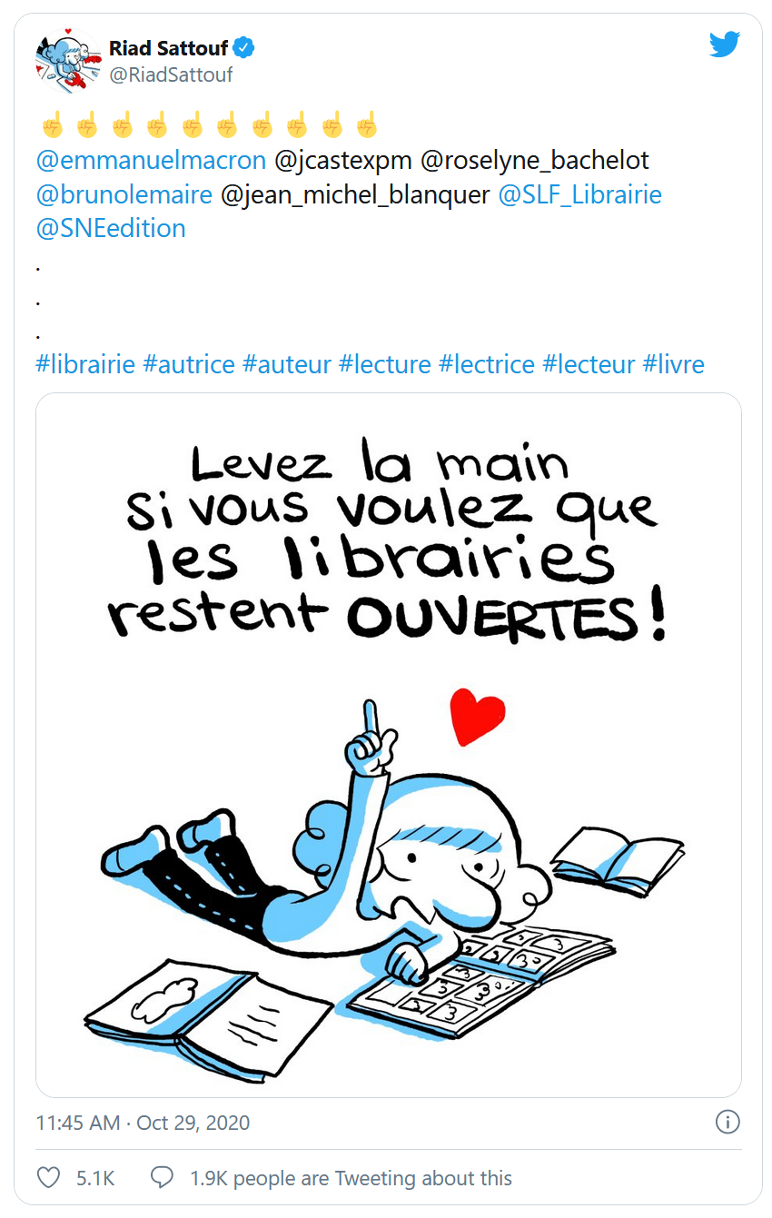 Le Chef de l'Etat l'a annoncé, tous les commerces qui ne vendent pas des denrées essentielles fermeront leurs portes. Les librairies ont donc été contraintes de suivre le mouvement, et cela a entraîné de très vives réactions dans le milieu du Livre. Afin d'illustrer leur combat, le dessinateur Riad Sattouf a réalisé un dessin pour appuyer l'idée que les librairies pourraient rester ouvertes durant le confinement, un dessin qui a depuis été partagé par plus de 2000 personnes sur Twitter :