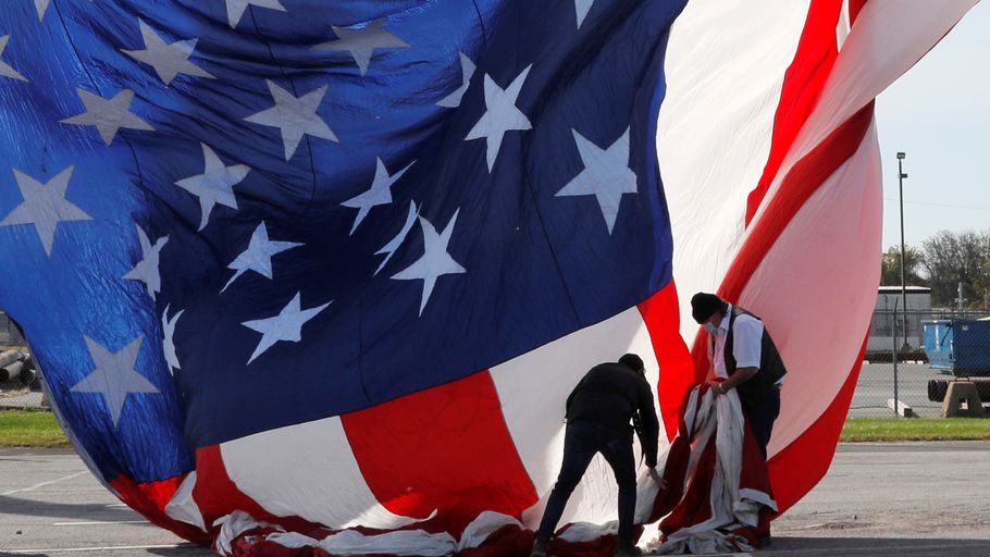 Des personnes accrochent un drapeau des Etats-Unis le jour du vote pour la présidentielle américaine à Wilmington (Delaware), le 3 novembre 2020.