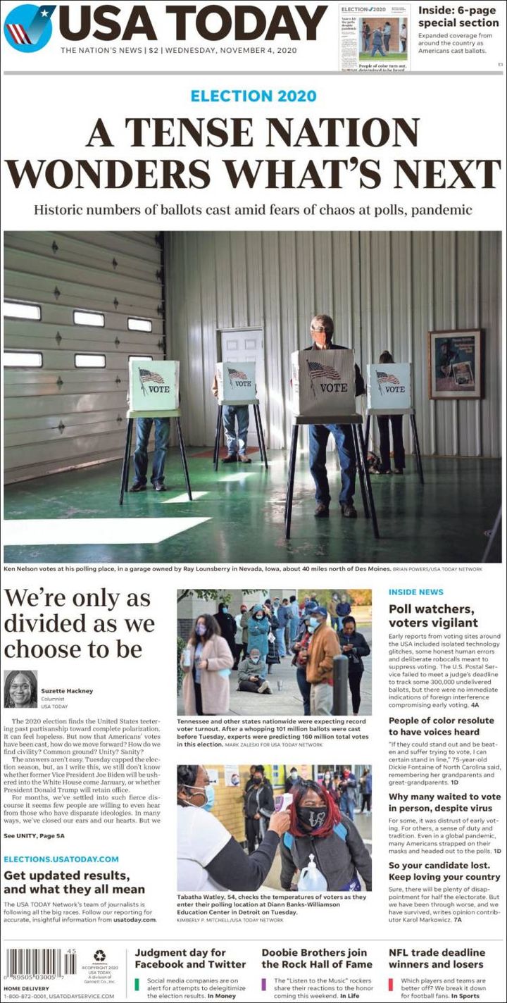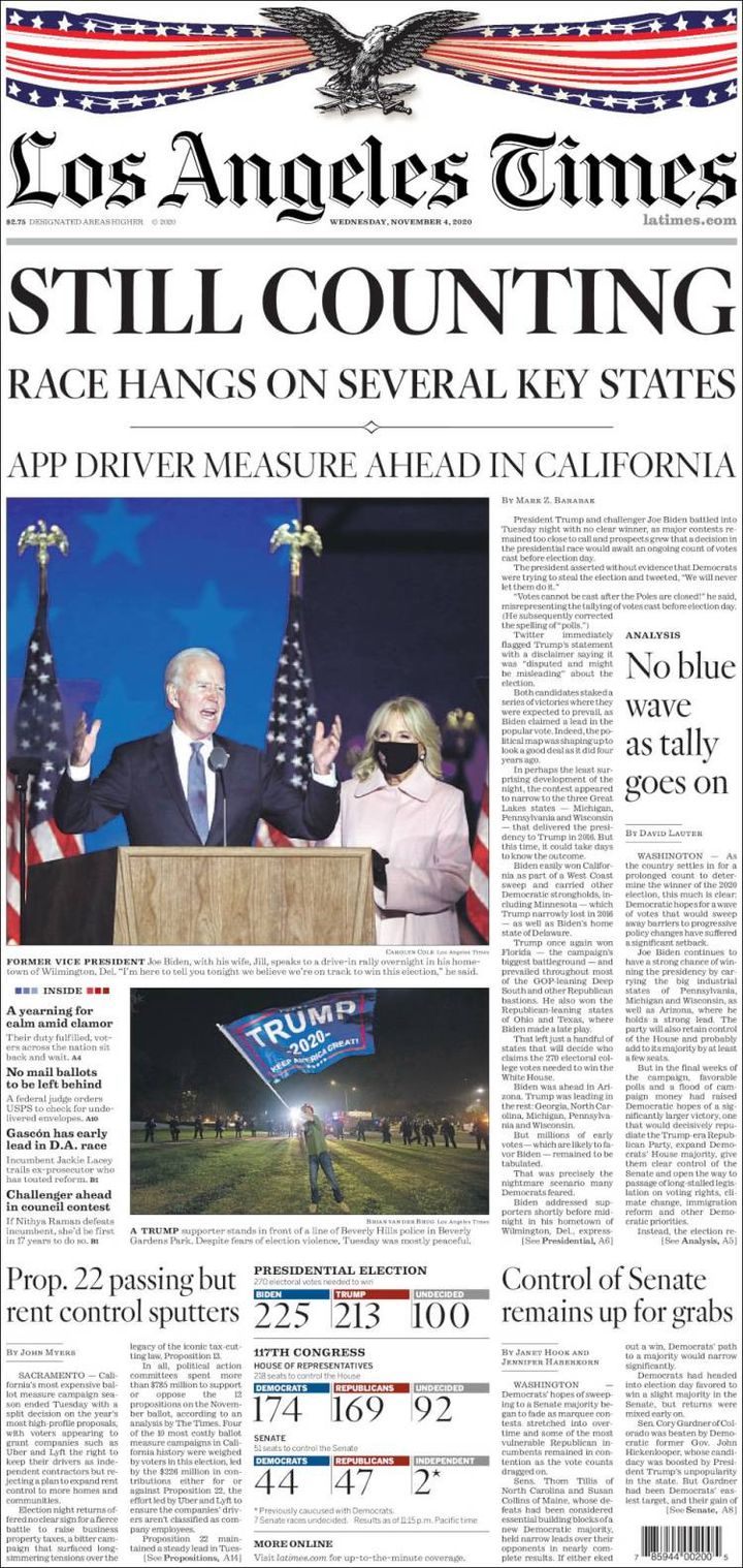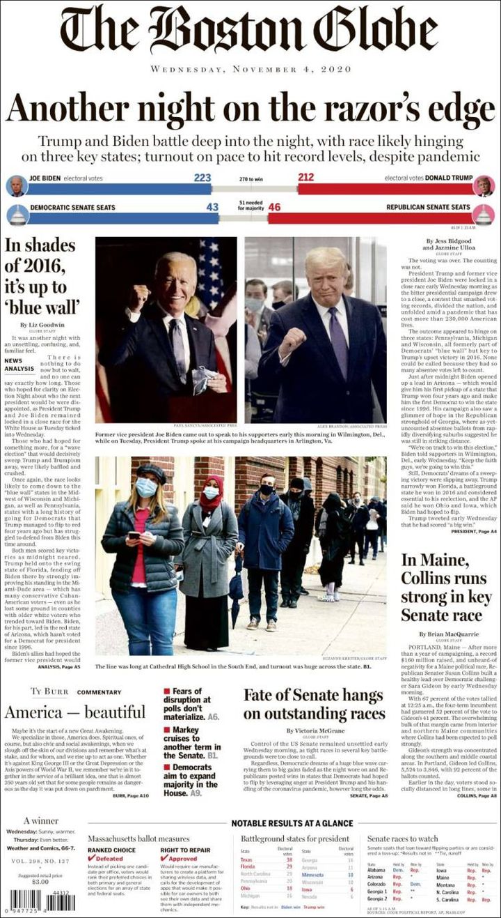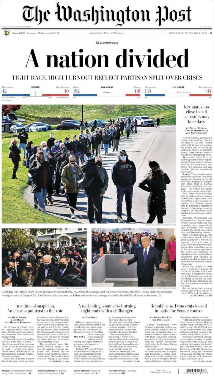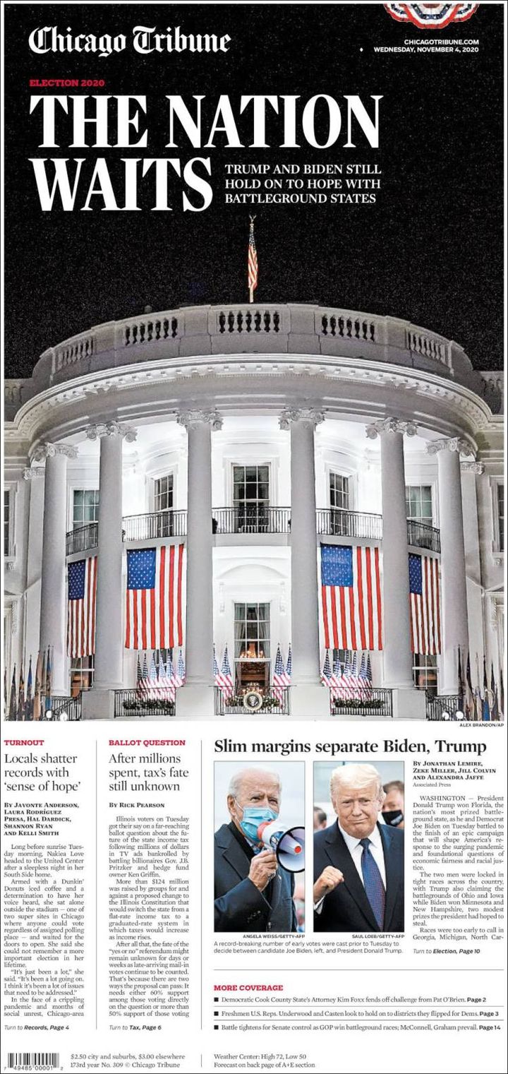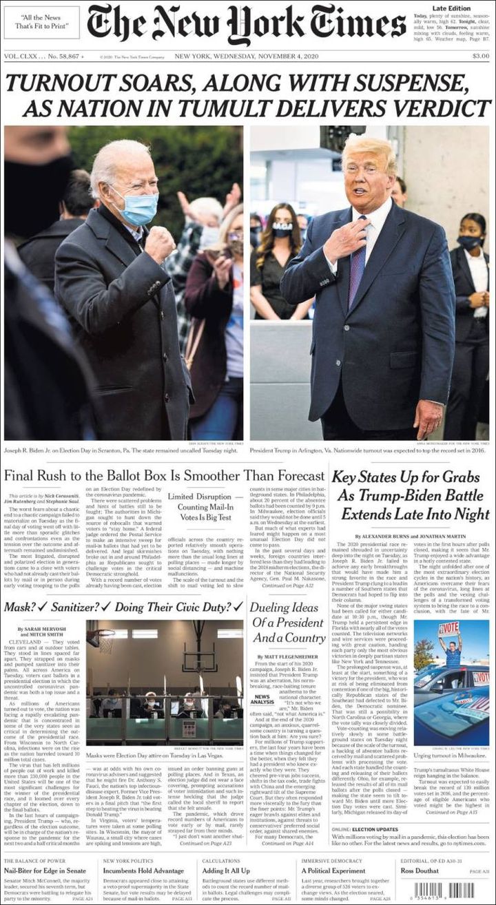 Combien de temps reste-t-il avant de connaître le futur locataire de la Maison Blanche ? Le New York Times insiste sur le "suspense" qui tient en haleine toute l'Amérique, alors que les bulletins continuent d'être dépouillés. Il évoque aussi "une nation en plein tumulte" dans l'attente du "verdict".