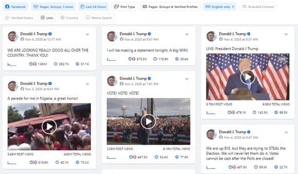 Si Donald Trump, malgré l'annonce infondée de sa victoire, est encore loin d'avoir remporté le scrutin américain, il peut compter sur Facebook comme l'un de ses principaux relais. D'après les données récoltées par BFMTV sur l'outil de veille Crowdtangle, le président américain en exercice a publié sept des dix publications les plus populaires sur le réseau social de ces dernières vingt-quatre heures.