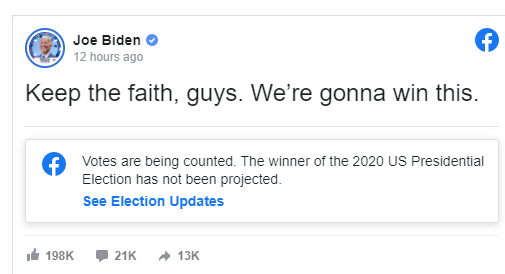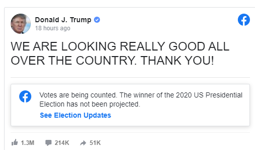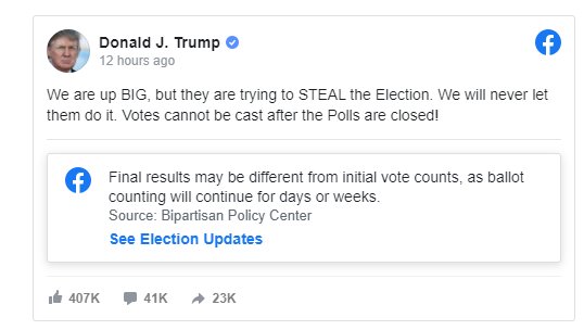 Depuis le début de l'élection américaine, les réseaux sociaux tentent de juguler le déluge de fausses informations, avec plus ou moins de réussite. Twitter a notamment décidé d'inscrire un message d'avertissement sur les publications de Donald Trump évoquant une fraude électorale. De son côté, Facebook s'est contenté d'ajouter un message rappelant que tous les bulletins de vote n'avaient pas été décomptés.