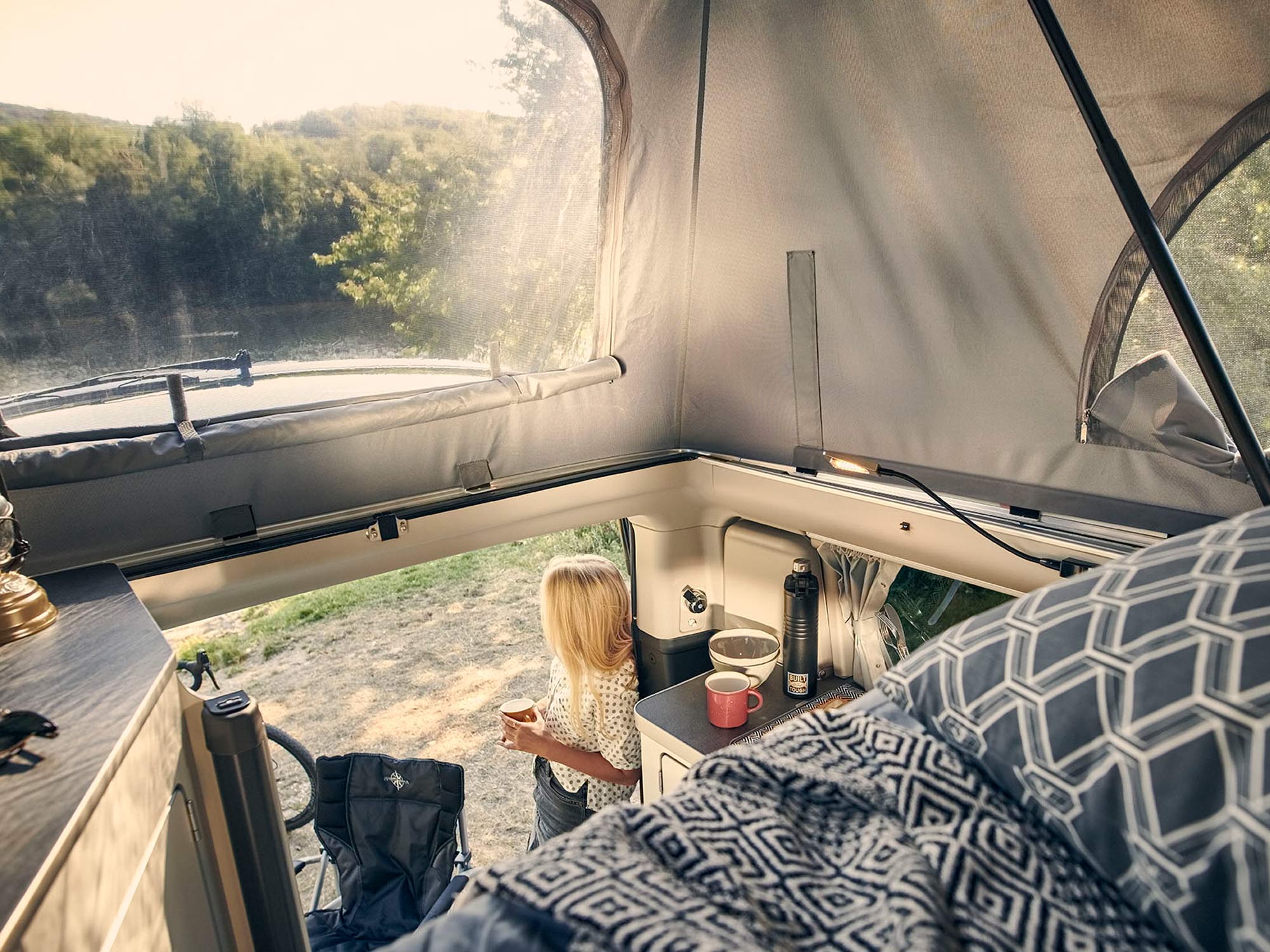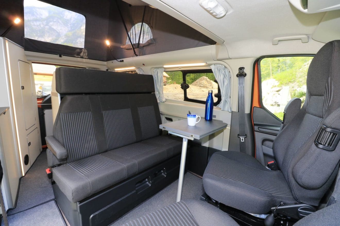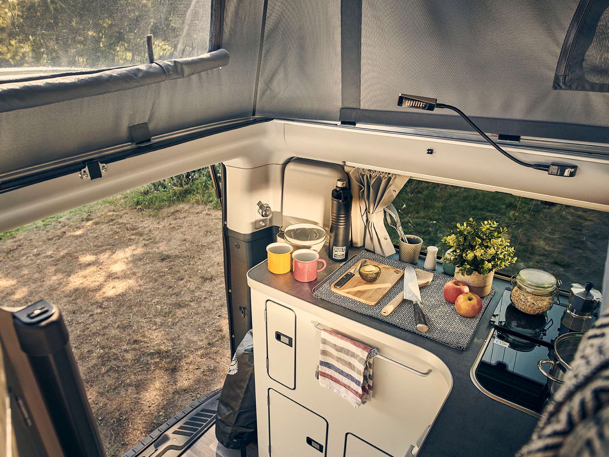 En configuration jour, l'aménagement spécifique du Nugget laisse d'ailleurs un grand volume disponible pour le mobilier de plein air, justement dans le creux du bloc cuisine, et le coffre compartimenté que l'on trouve sous l'assise peut, lui, accueillir du matériel en complément (duvets, câble de camping, chaussures, etc.)