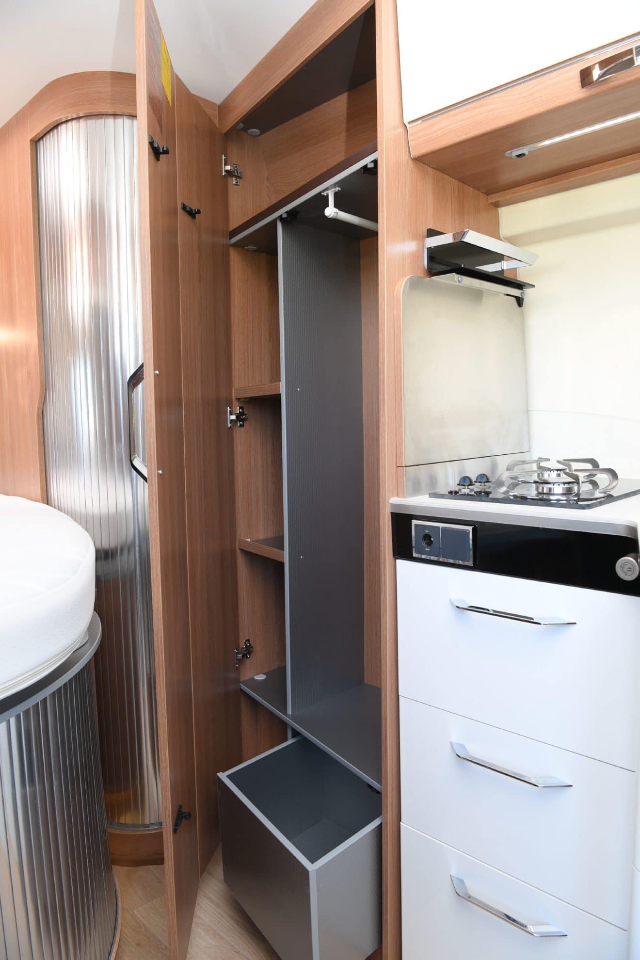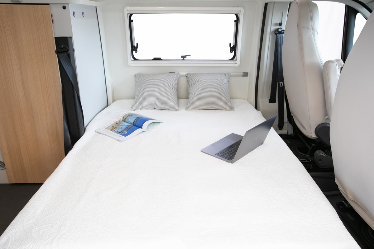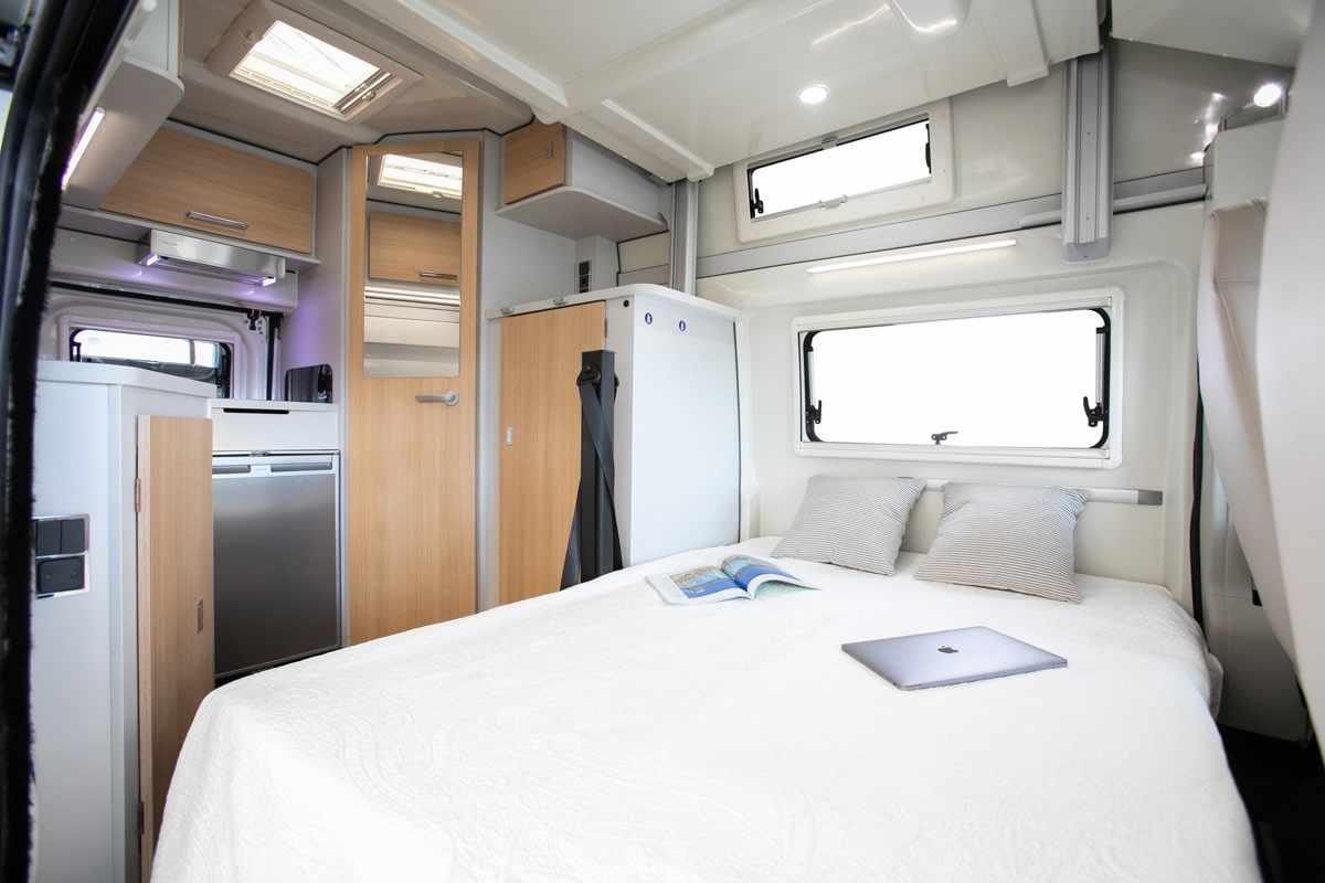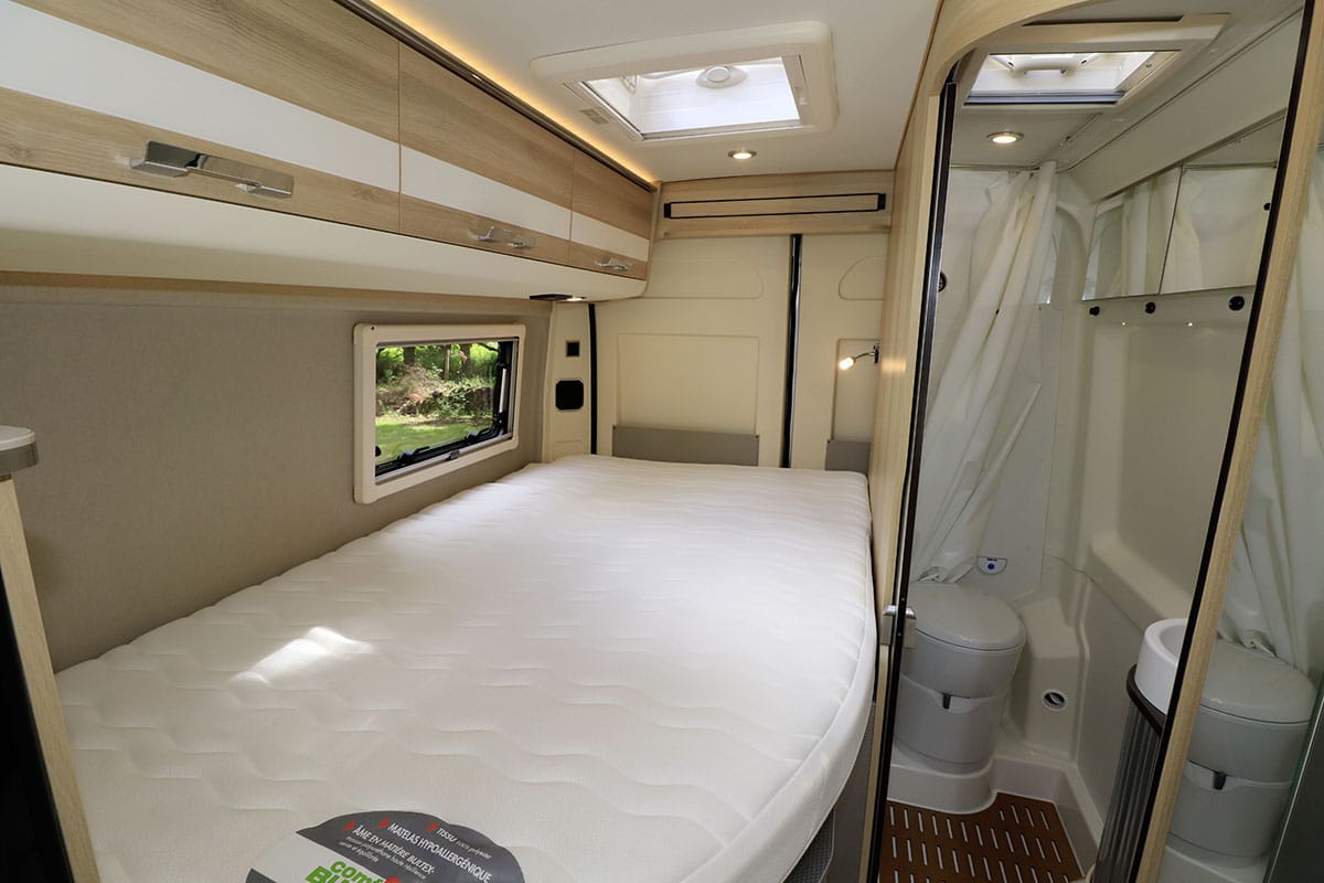 Il en est de même pour les volumes de rangement, variés, voire inédits pour les casiers hauts qui assurent la séparation entre la cuisine et le salon. Le stockage des vêtements et autres effets personnels se fait côté droit du van, où l'on trouve un grand placard compartimenté (également accessible depuis l'extérieur lorsque le hayon est ouvert) qui surplombe un coffre au sol, et, dans le prolongement, un autre volume plus étroit dissimulé sous une tablette. Mention très bien, enfin, pour le lit haut, aussi bien dimensionné (134 x 200 cm) que douillet avec son matelas/sommier à coupelles Fröli.
