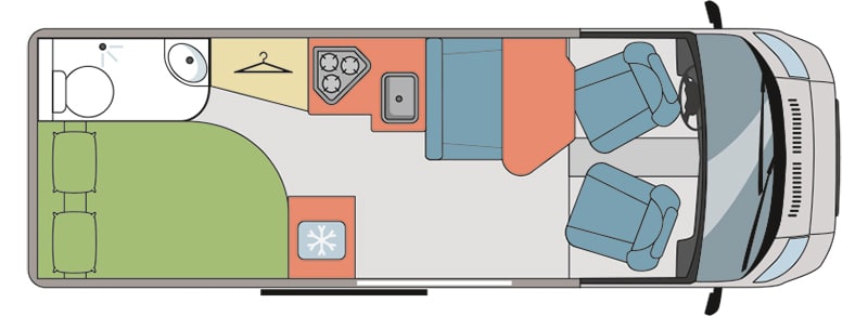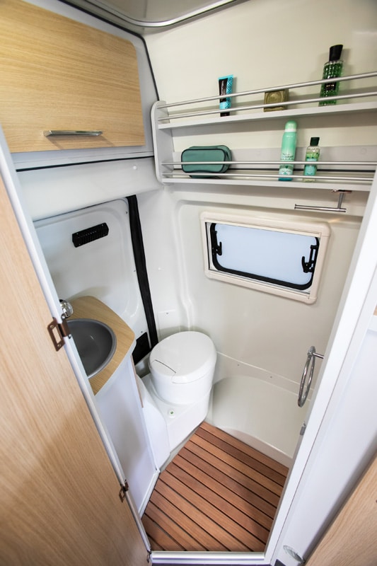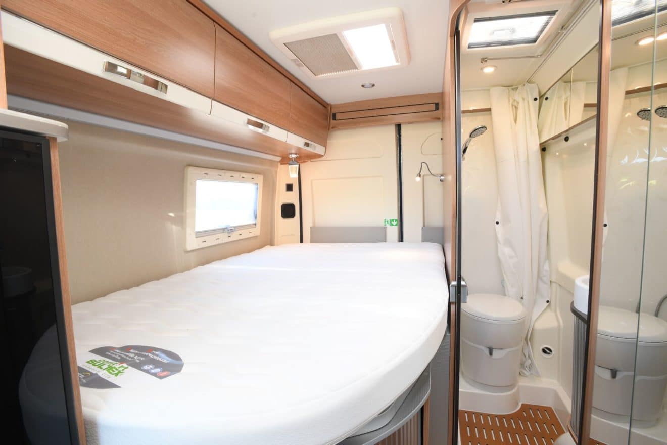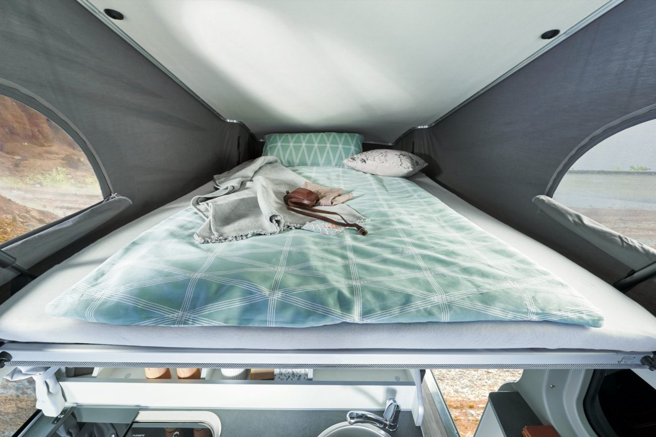 Il en est de même pour les volumes de rangement, variés, voire inédits pour les casiers hauts qui assurent la séparation entre la cuisine et le salon. Le stockage des vêtements et autres effets personnels se fait côté droit du van, où l'on trouve un grand placard compartimenté (également accessible depuis l'extérieur lorsque le hayon est ouvert) qui surplombe un coffre au sol, et, dans le prolongement, un autre volume plus étroit dissimulé sous une tablette. Mention très bien, enfin, pour le lit haut, aussi bien dimensionné (134 x 200 cm) que douillet avec son matelas/sommier à coupelles Fröli.