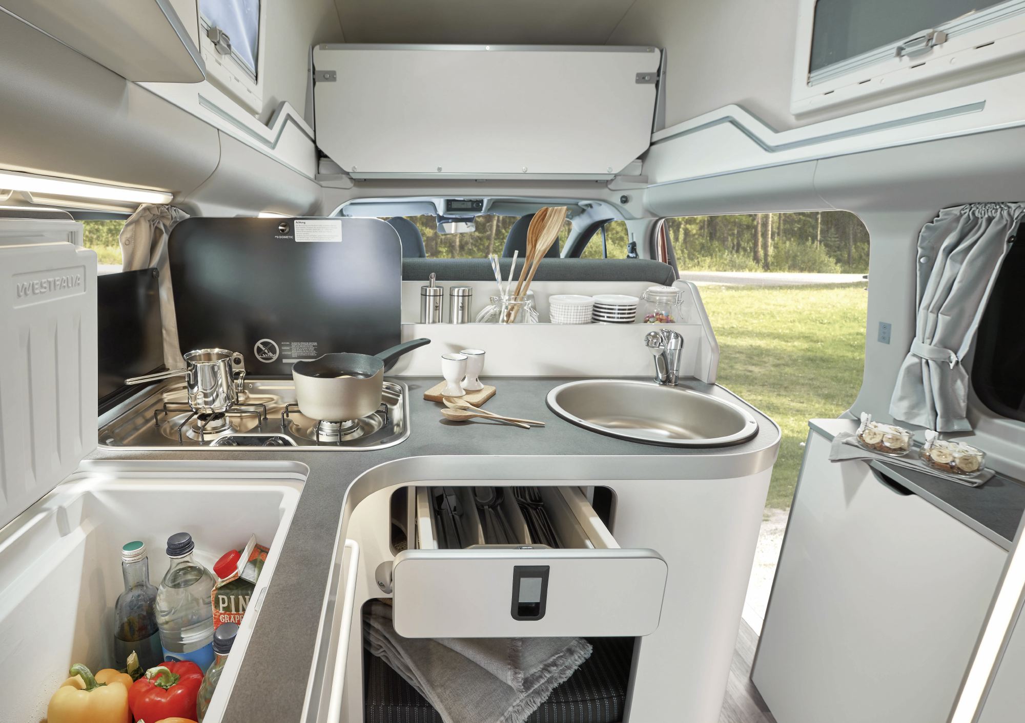 Aménagé par Westfalia directement pour le compte de Ford, le Nugget compte la cuisine comme pièce maîtresse.