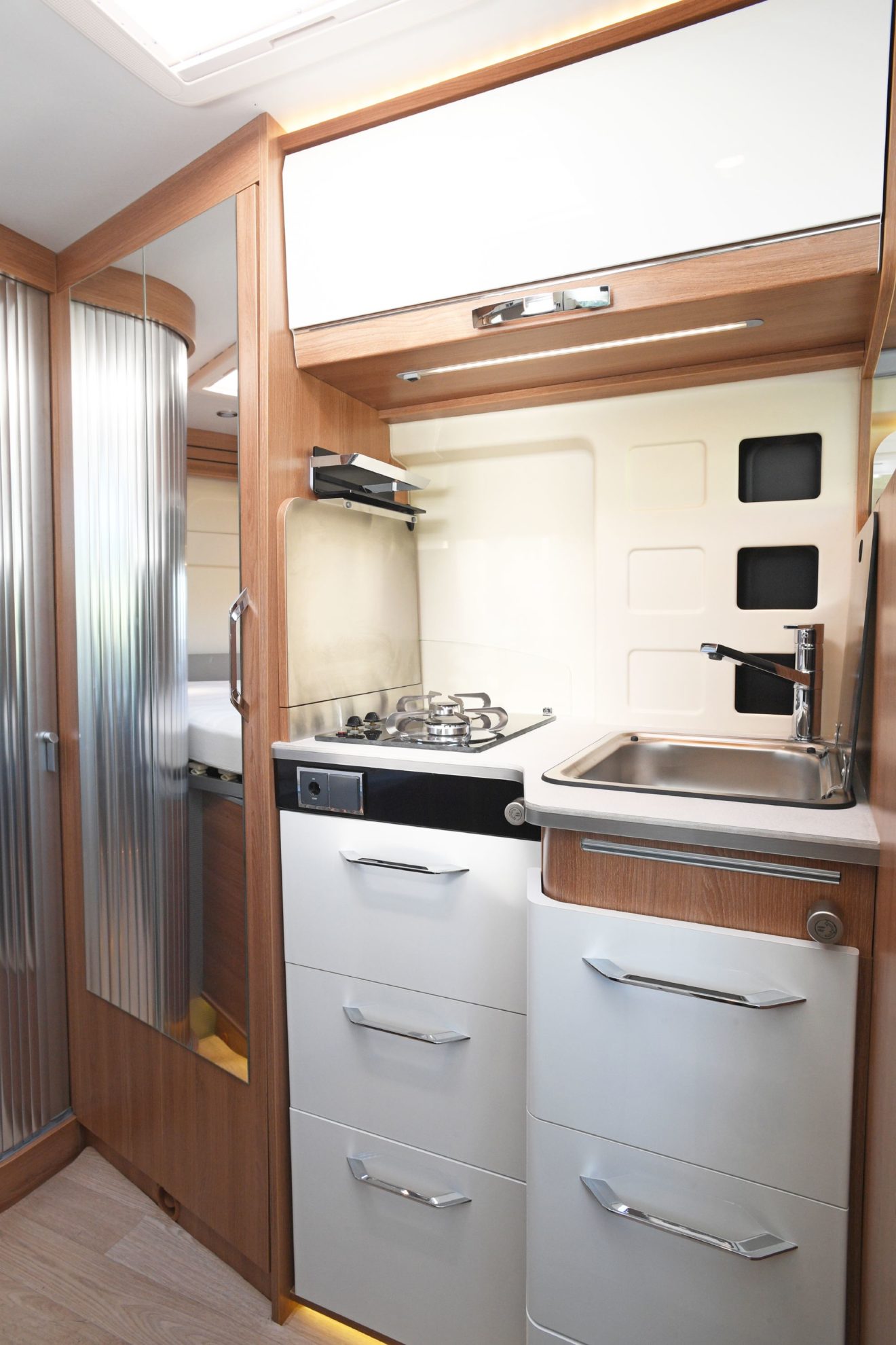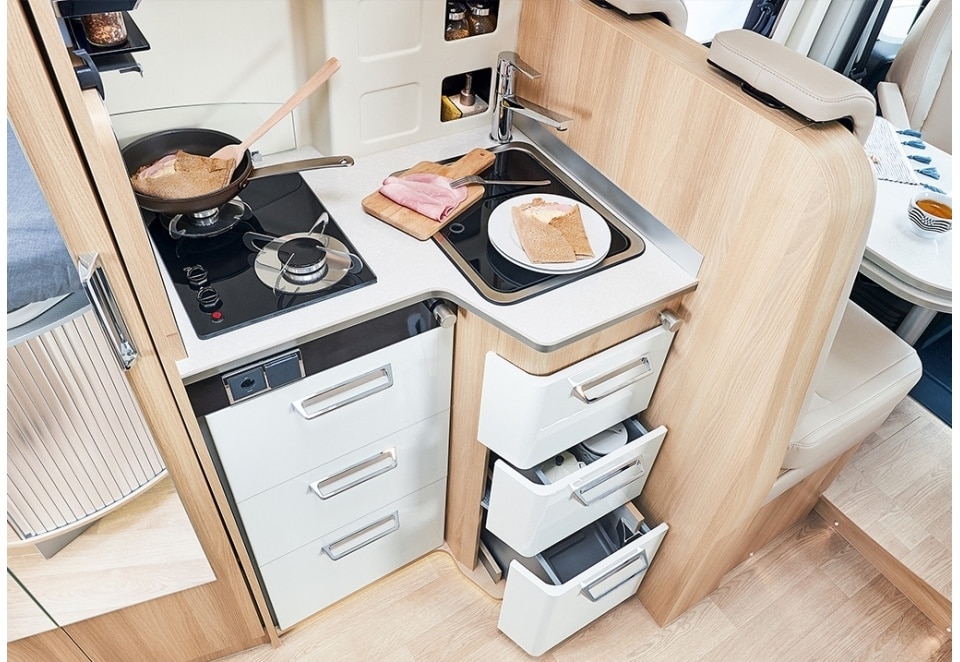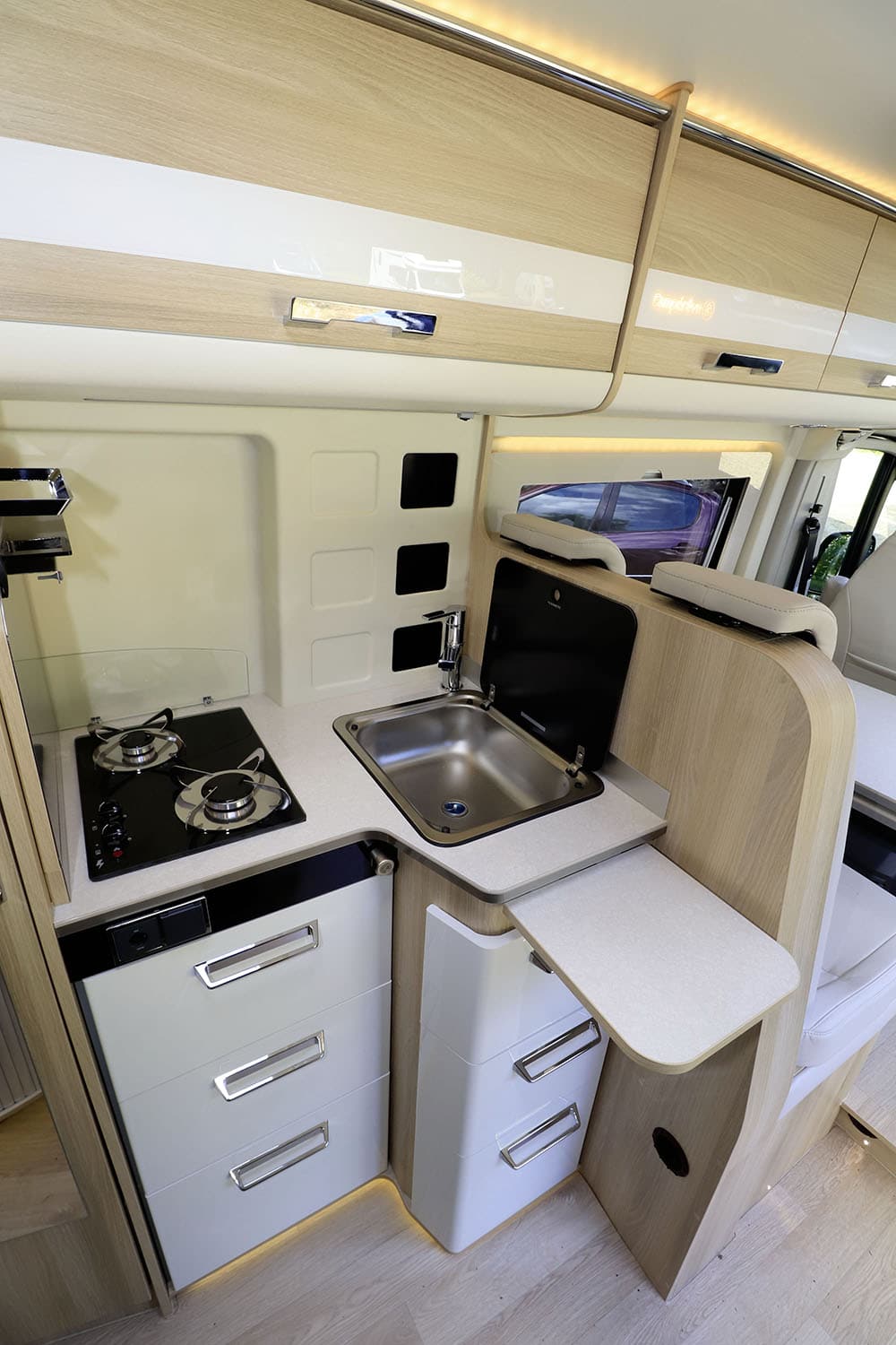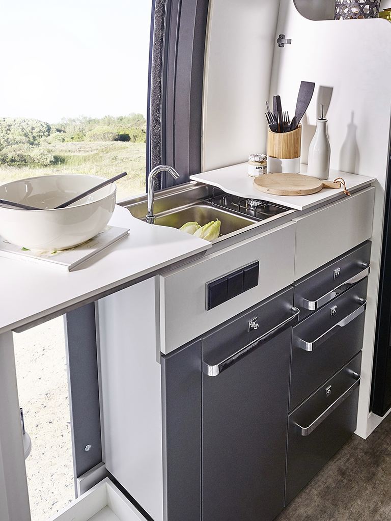 Si le choix d'emplacement de la cuisine, dans le prolongement de la banquette, est courant parmi les camping-cars de type profilé, il est rare sur le secteur du fourgon. La pièce est aussi esthétique que pratique : le bloc meuble affiche 48 cm de profondeur au niveau du réchaud et 59 cm de profondeur au niveau de l'évier. On y apprécie les volumes de rangement bas avec deux ensembles de trois tiroirs très logeables et verrouillables par colonne à l'aide d'une manette.