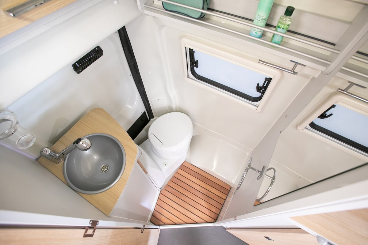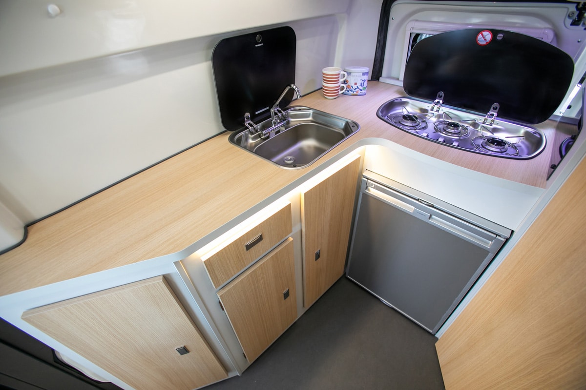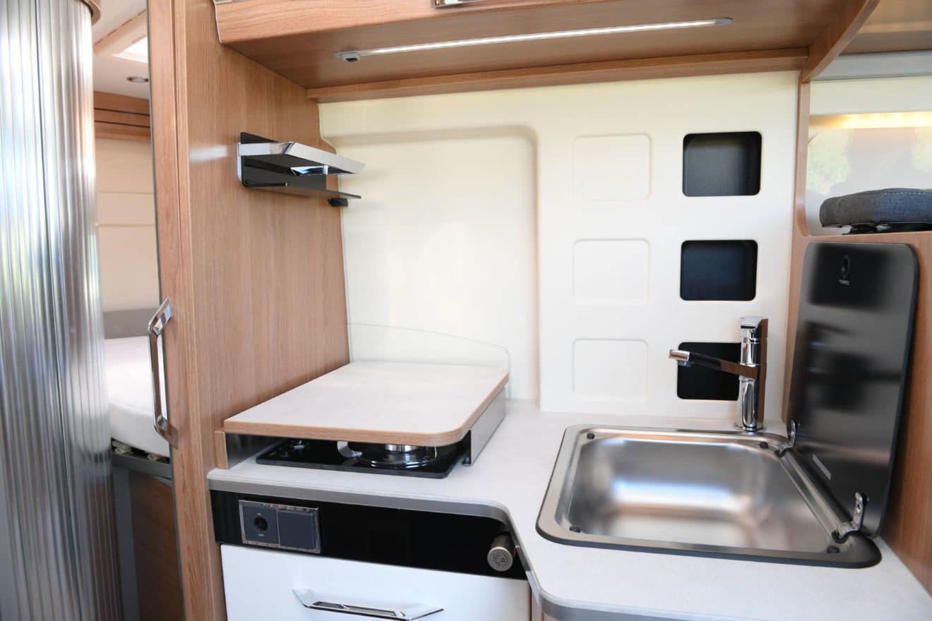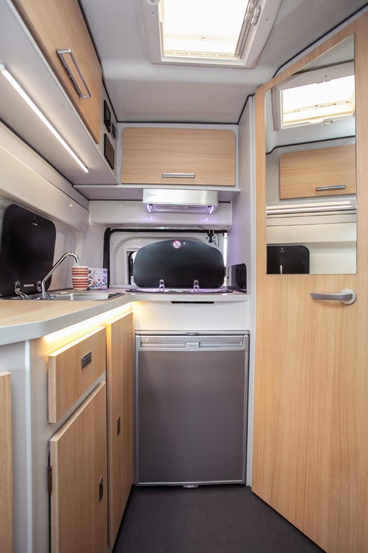 Si le choix d'emplacement de la cuisine, dans le prolongement de la banquette, est courant parmi les camping-cars de type profilé, il est rare sur le secteur du fourgon. La pièce est aussi esthétique que pratique : le bloc meuble affiche 48 cm de profondeur au niveau du réchaud et 59 cm de profondeur au niveau de l'évier. On y apprécie les volumes de rangement bas avec deux ensembles de trois tiroirs très logeables et verrouillables par colonne à l'aide d'une manette.