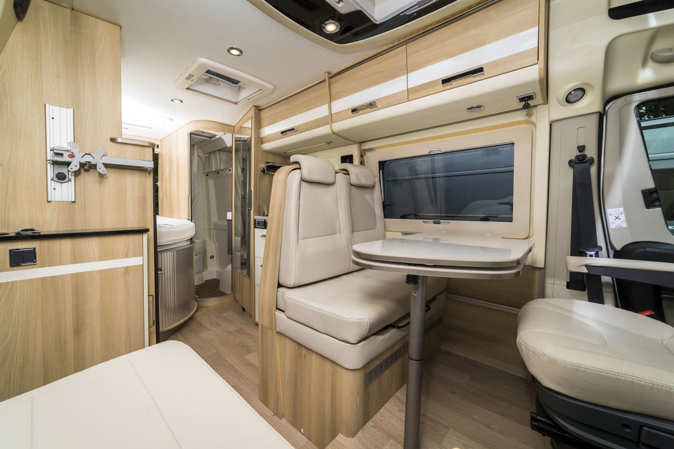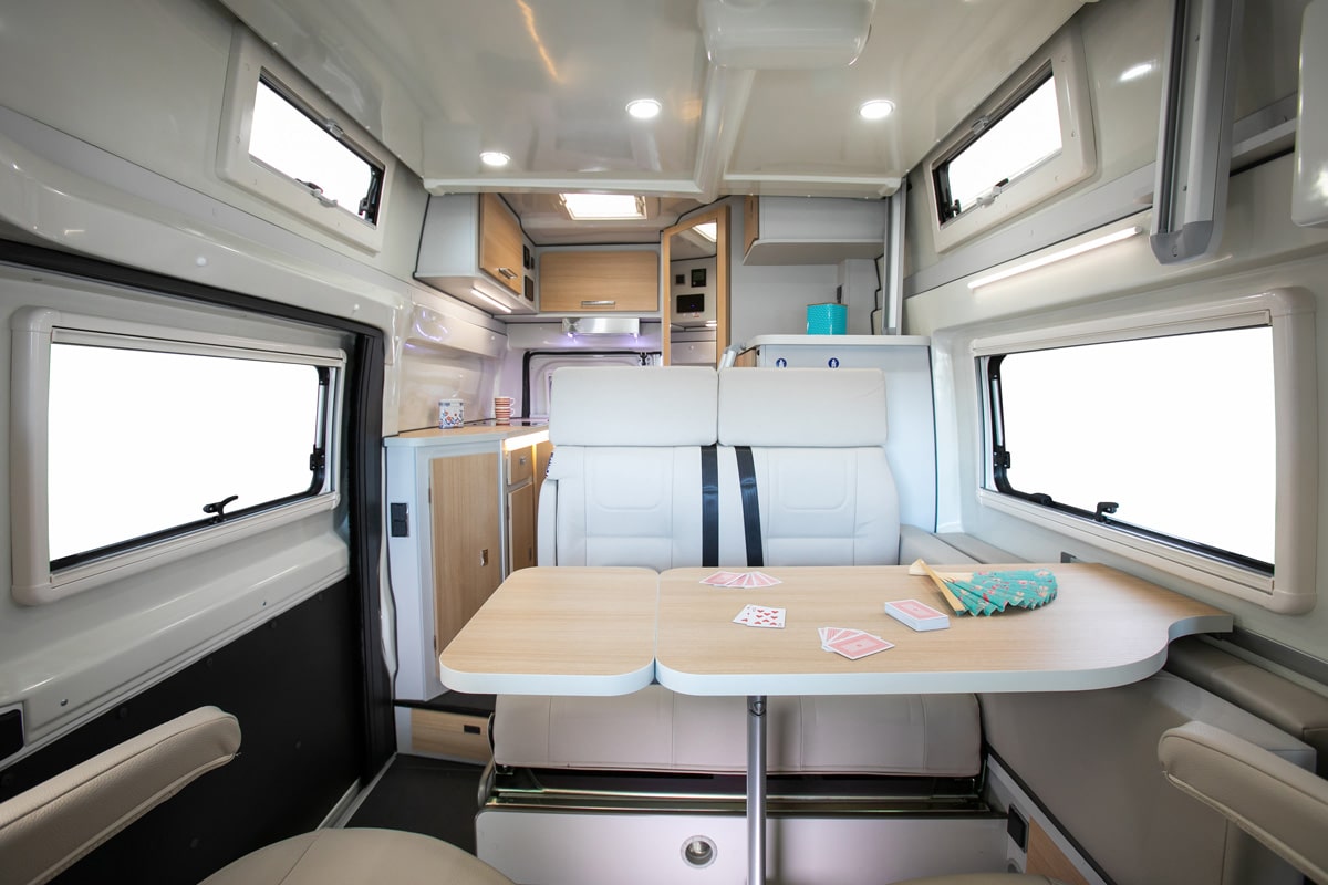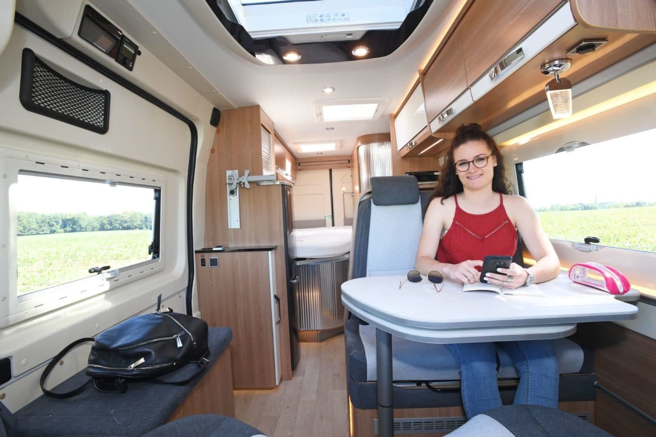 On apprécie sa capacité d'accueil de cinq places route, puisque la banquette du salon (125 cm de large) dispose de trois ceintures de sécurité. On observe rapidement l'ingéniosité de son plan, avec cette assise convertible façon clic-clac en un bon lit double (125/102 x 190 cm).