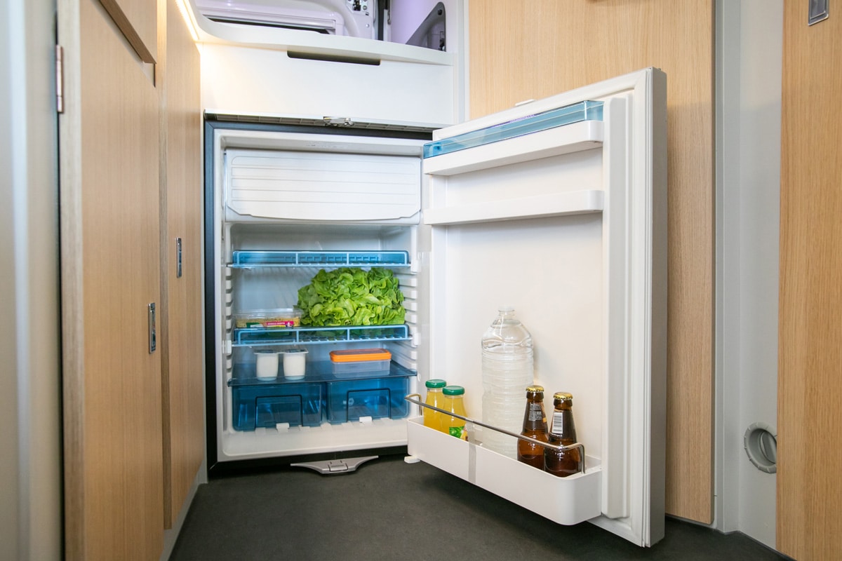 Ses deux feux en saillie se recouvrent d'un solide plan de travail rabattable, un porte-épices est prévu sur le côté, et trois niches fourre-tout sont creusées dans la double paroi derrière l'évier. Bien vu, en complément, un réfrigérateur de 135 litres se situe juste en face.