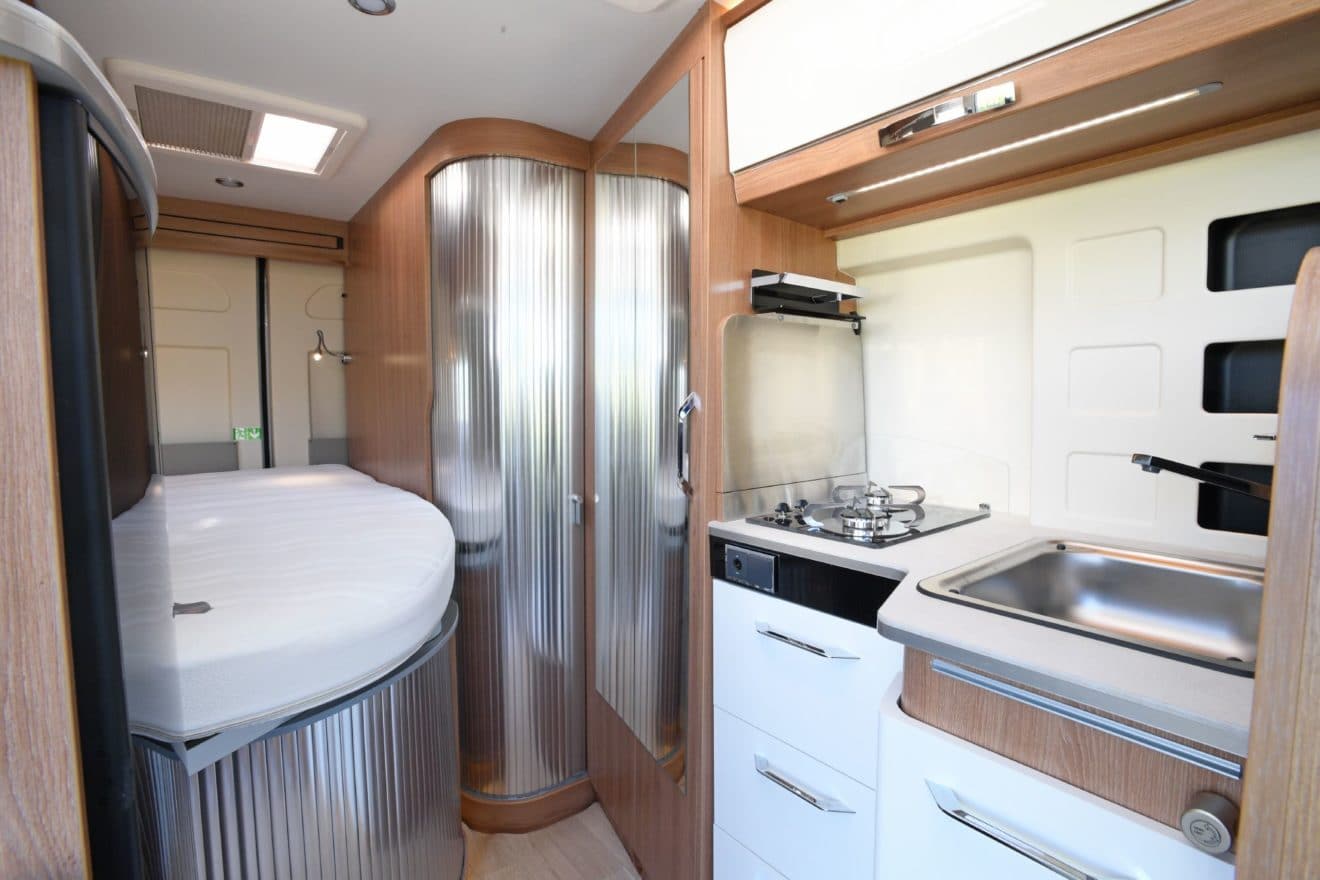 Pour un fourgon, même grand puisque celui-ci loge dans un Fiat Ducato de 6,36 m, l'agencement du Magellan Limited 742 a vraiment de quoi surprendre. À l'avant un grand salon doté d'un skyview, à l'arrière une pièce nuit composée d'un lit en long accolé à une salle d'eau et, au centre, cette superbe cuisine dessinant un L lorsque son plan de travail/desserte amovible est en place.