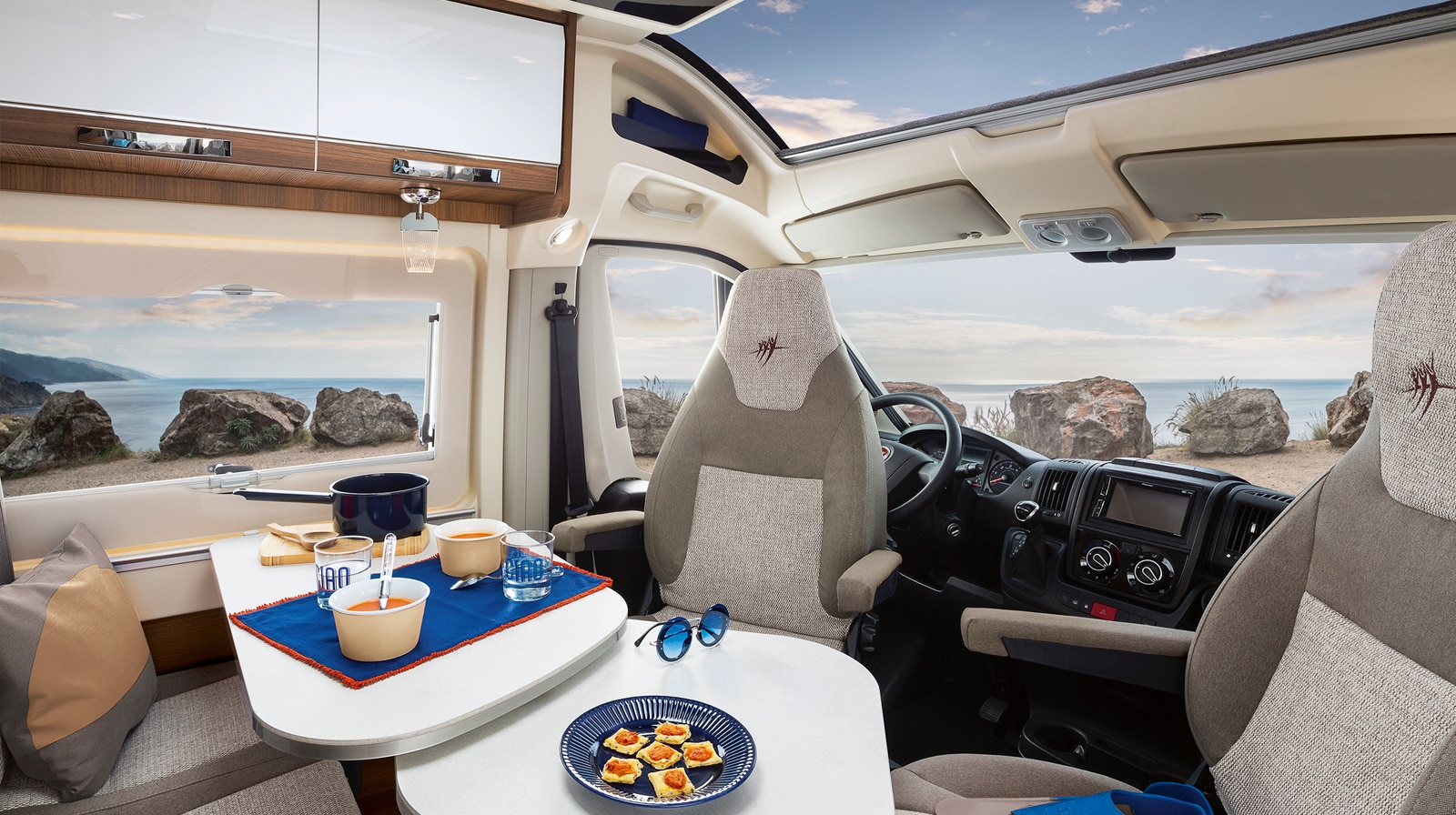 Pas de chambre au niveau du plancher dans le Bel Horizon, mais un lit double de pavillon (à assistance électrique) qui descend à la demande juste au-dessus du salon avant. Tout cela pour disposer d'un agencement « jour » généreux alors que ce modèle Font Vendôme, imaginé il y a déjà 25 ans, reste très court, sous les 5,50 m de longueur hors tout.