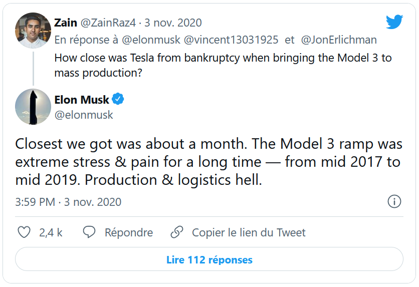 Elon Musk est revenu sur le sujet pour parler là encore de faillite. Après 2008, puis 2012 et la Model S, les enjeux n'étaient plus les mêmes, mais la production de la Model 3 et son retard a fait très mal à la marque et à la confiance de ses investisseurs. À cette question, le président de Tesla répondait que « le plus proche que nous ayons eu [avant la faillite] était d'environ un mois. La production de la Model 3 a longtemps été stressante et douloureuse - de mi-2017 à mi-2019 ».