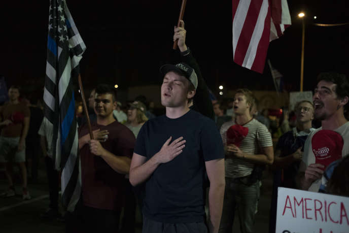 De jeunes partisans de Donald Trump chantent l'hymne national américain devant le centre de dépouillement de Phoenix (Arizona), jeudi 5 novembre.