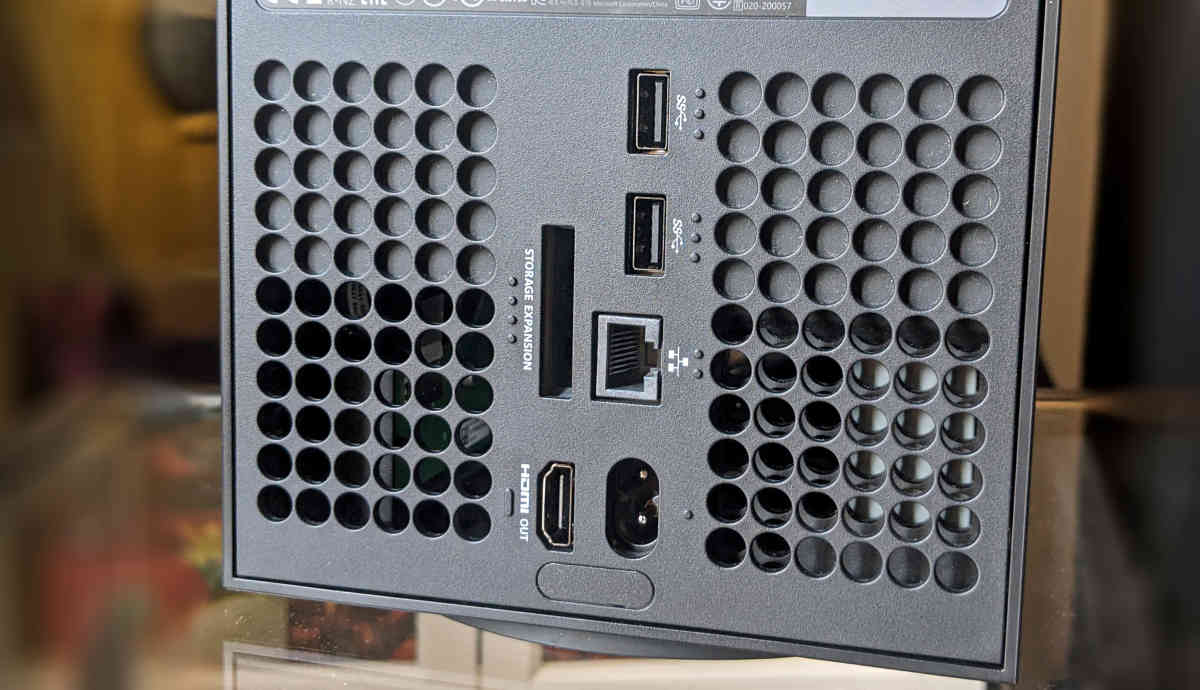 A l'arrière, la Xbox Series X propose, outre les indispensables ports d'alimentation et HDMI, un port ethernet, une extension pour un disque dur externe (vendu séparément) et deux ports USB (en plus de celui de la façade).