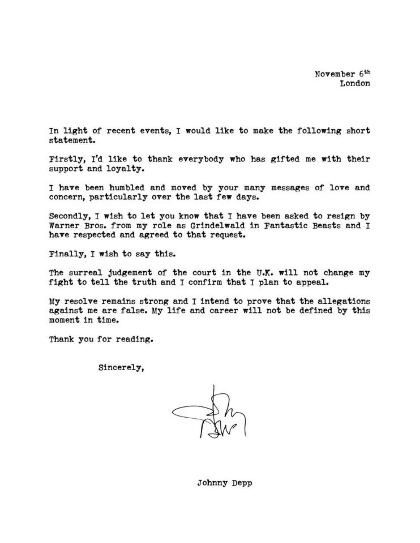 Deuxièmement, je souhaite vous informer que Warner Bros m'a demandé de renoncer à mon rôle de Gellert Grindelwald dans Les Animaux fantastiques, ce que j'ai accepté.