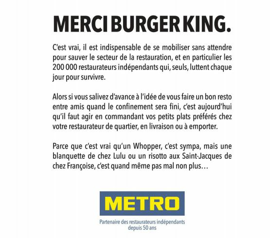 En effet, en détournant le message de Burger King, le grossiste METRO a diffusé un encart intitulé "MERCI BURGER KING" en réponse au message de soutien diffusé dans la presse nationale le week-end dernier.