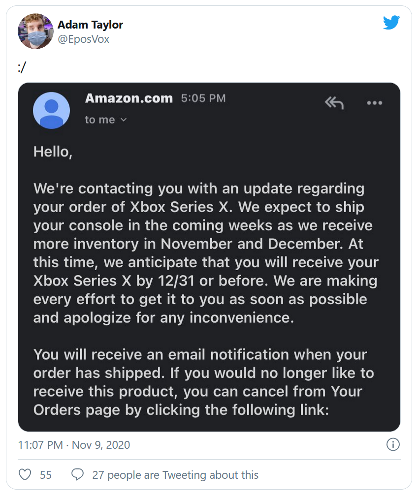 C'est en ce mardi 10 novembre que sortent les Xbox Series S et X. L'occasion pour les joueurs l'ayant précommandé au préalable de mettre la main sur la prochaine génération de consoles côté Microsoft. Malheureusement, les faibles quantités de stocks se font drastiquement ressentir chez les revendeurs, même les plus gros. Sur Twitter, un joueur américain ayant précommandé une Xbox Series X chez Amazon a reçu un message de la part du géant du e-commerce l'informant qu'il risquait de ne pas recevoir sa console avant le 31 décembre prochain.
